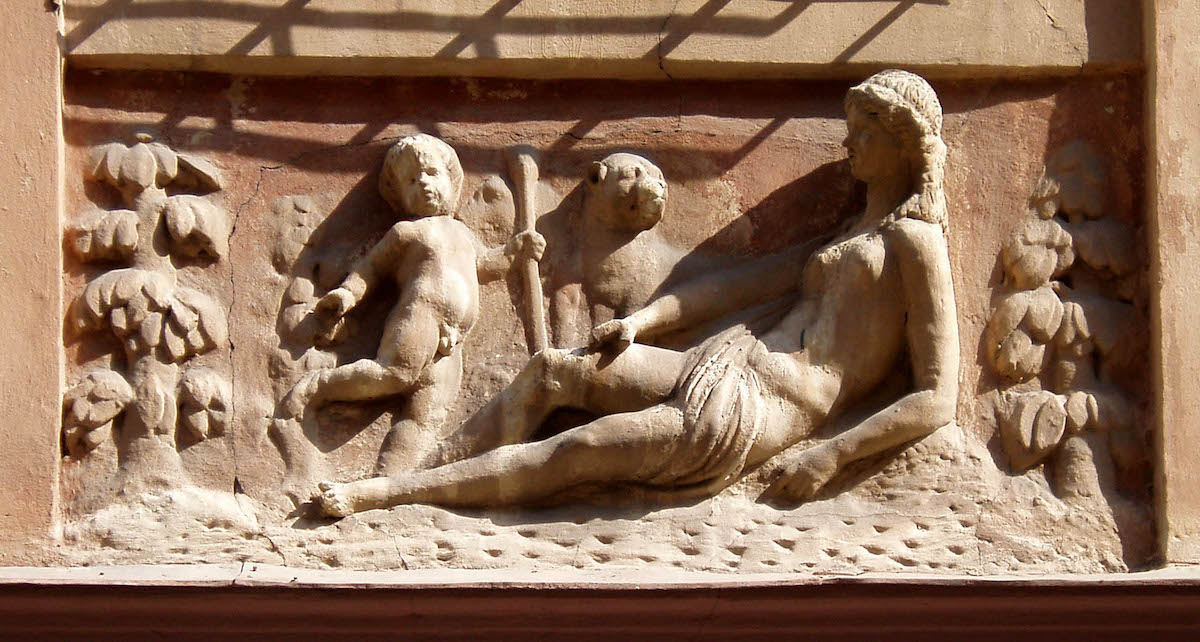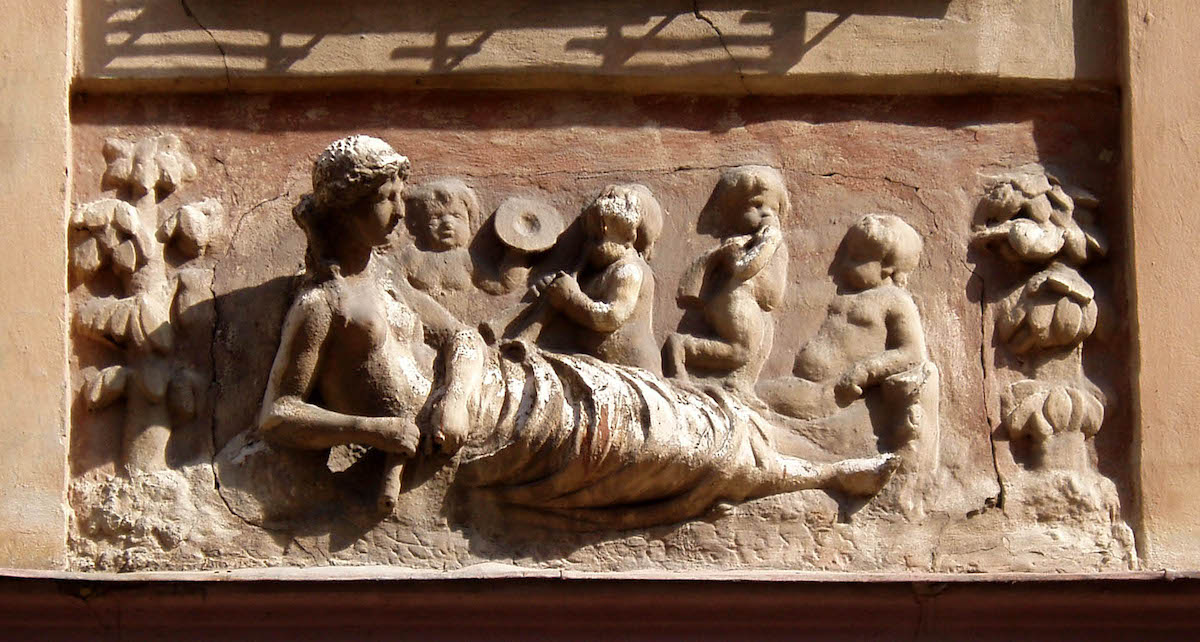Рельєфний фриз між другим і третім поверхами зображає античних богів Марса й Афіну в обрамленні орнаменту з троянд і рогів достатку. Під вікнами другого поверху розміщено три рельєфи з німфами, що відпочивають серед дерев і амурів.