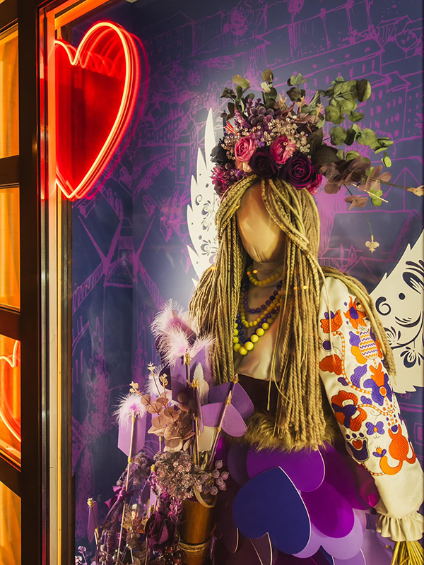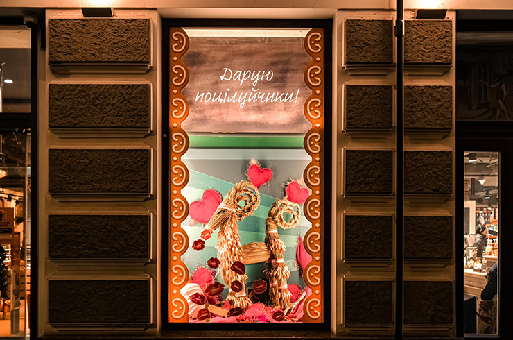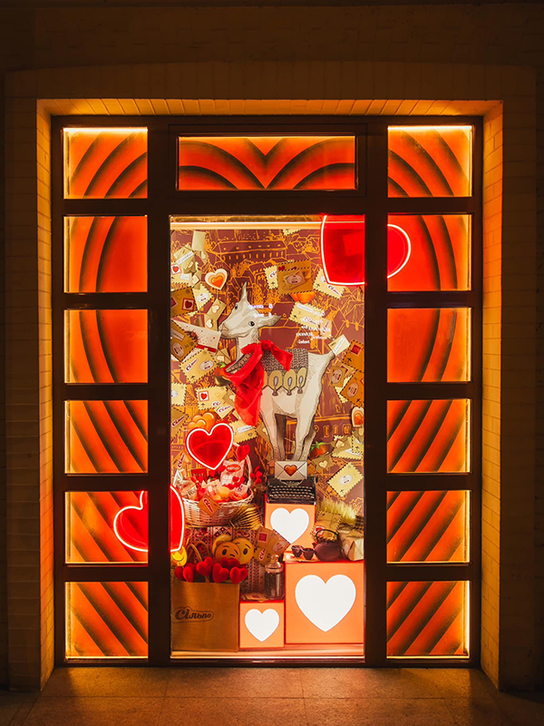 У Дніпрі в одній з вітрин зобразили козу, яка поїдаючи цукерки, друкує своїми копитами любовні листи, віддаючи шану естетиці минулого, та надсилає емодзі, використовуючи сучасні можливості для прояву почуттів. В іншій вітрині можна побачити мати-мисливицю у вигляді янгола, яка наповнила кошики солодкою здобиччю, щоб ділитися нею, як і своєю любовʼю, зі своїми дітьми. Вона – втілення сили та краси жінки.