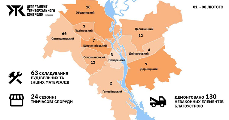 Серед незаконних споруд найбільше було складів будівельних та інших матеріалів – 63, а також сезонних тимчасових споруд – 24. Найбільше незаконних елементів благоустрою демонтували у Святошинському – 66, Оболонському – 16, та Соломʼянському і Деснянському – по 12 у кожному.