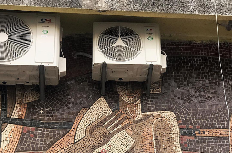 Ще одне з 11 мозаїчних панно на бульварі Лесі Українки в Києві постраждало – там встановили кондиціонер прямо на обличчя зображеної людини, повідомляє спільнота Child of socialism в Instagram.