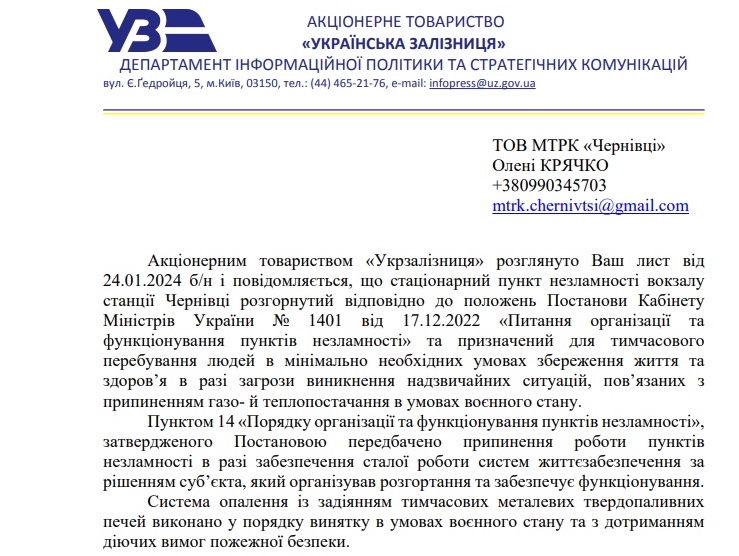 На початку лютого місцеве видання Чернівецький промінь повідомляло, що попри вимогу міськради буржуйки на вокзалі так і не прибрали. Ба більше, їх укомплектували новою партією дров та встановили UFO-обігрівачі.