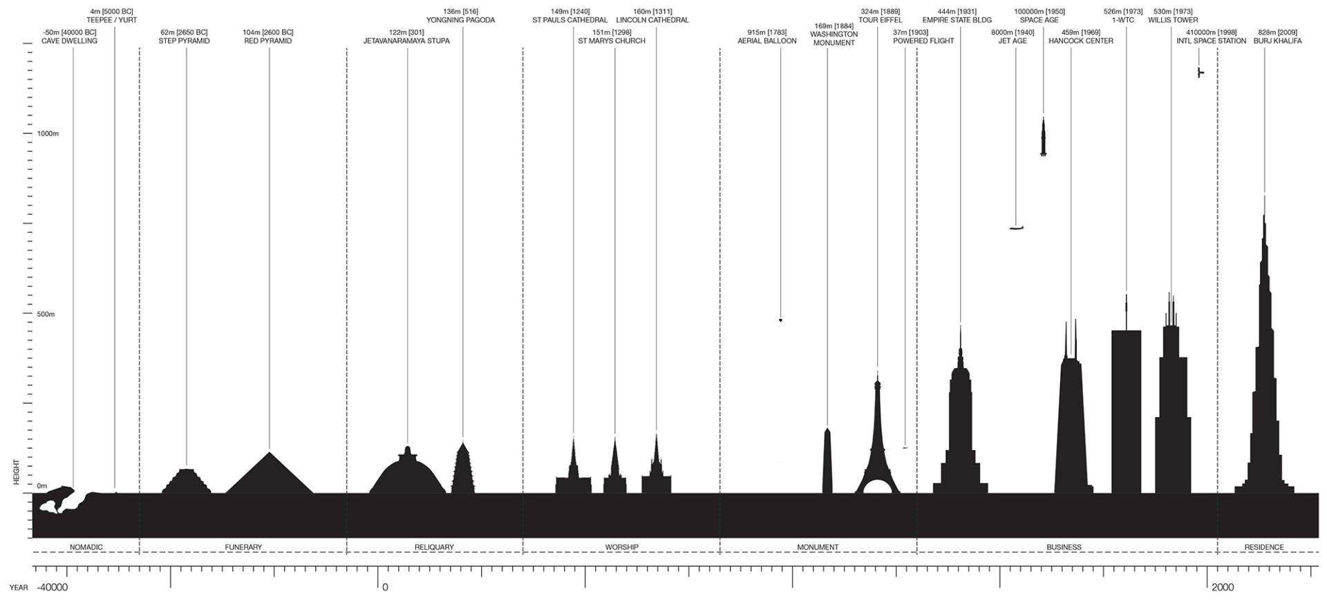 Як пояснюють архітектори, докладаючи діаграму (й, очевидно, іронізуючи), — з плином часу людство будувало вже вищі, тонші та легші споруди, висота яких зростала в геометричній прогресії. Якщо застосовати методи ринкового прогнозування, дійдемо висновку, що будівлі сягатимуть все нових висот, доки ми не витіснимо себе з поверхні планети.