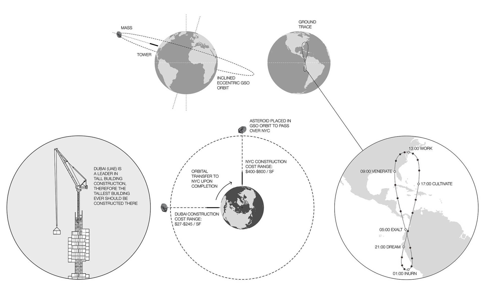 Архітектори Clouds AO пропонують розташувати на орбіті великий астероїд і пустити від нього надміцний кабель, який триматиме хмарочос. Будівлю можна збудувати будь-де — передачається, що це буде Дубай, бо там значно нижча вартість будівельних робіт і матеріалів, ніж у Нью-Йорку — і перемістити так само у будь-яку бажану локацію.