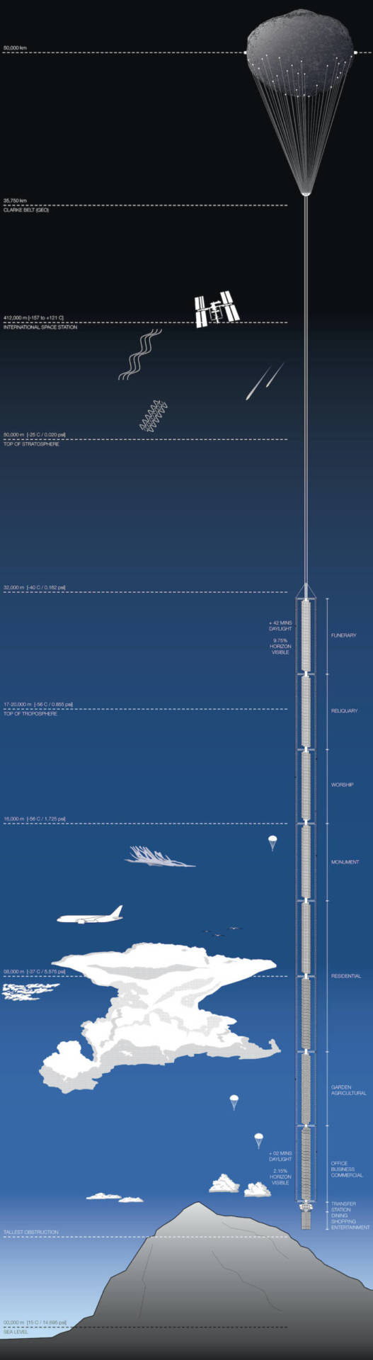 Мегаструктура висітиме над поверхнею землі, не дістаючи до неї трохи більш як кілометр. До неї можна дістатися гелікоптером або на іншому подібному транспорті.