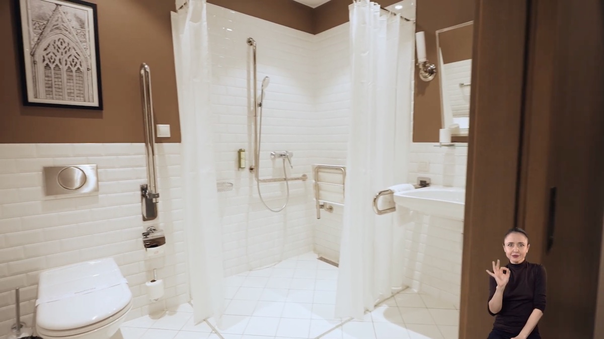 Адміністратор розповів, що переобладнати звичану готельну кімнату на такий номер складно: є просторові параметри вже наявного приміщення та обмеження вже прокладених комунікацій. Менш із тим, власникам вдалося зробити широкий вхід зі слайдерними дверима, які відчиняються автоматично після прикладання картки-ключа; ширші проходи та просторішу кімнату; просторий санвузол. До ліжка можна під’їхати з обох боків, а приліжкові тумбочки прибрали, натомість передбачивши місце для речей на узголов’ї.