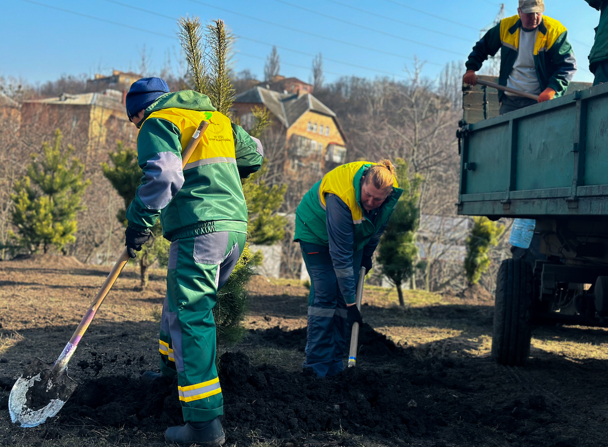 Це каштани, клени, липи, сосни, а також кущі бузку та дерену як живої огорожі. Впродовж весни планують висадити ще додатково 60 дерев.