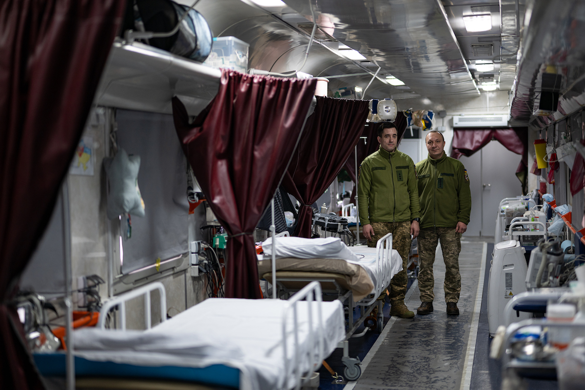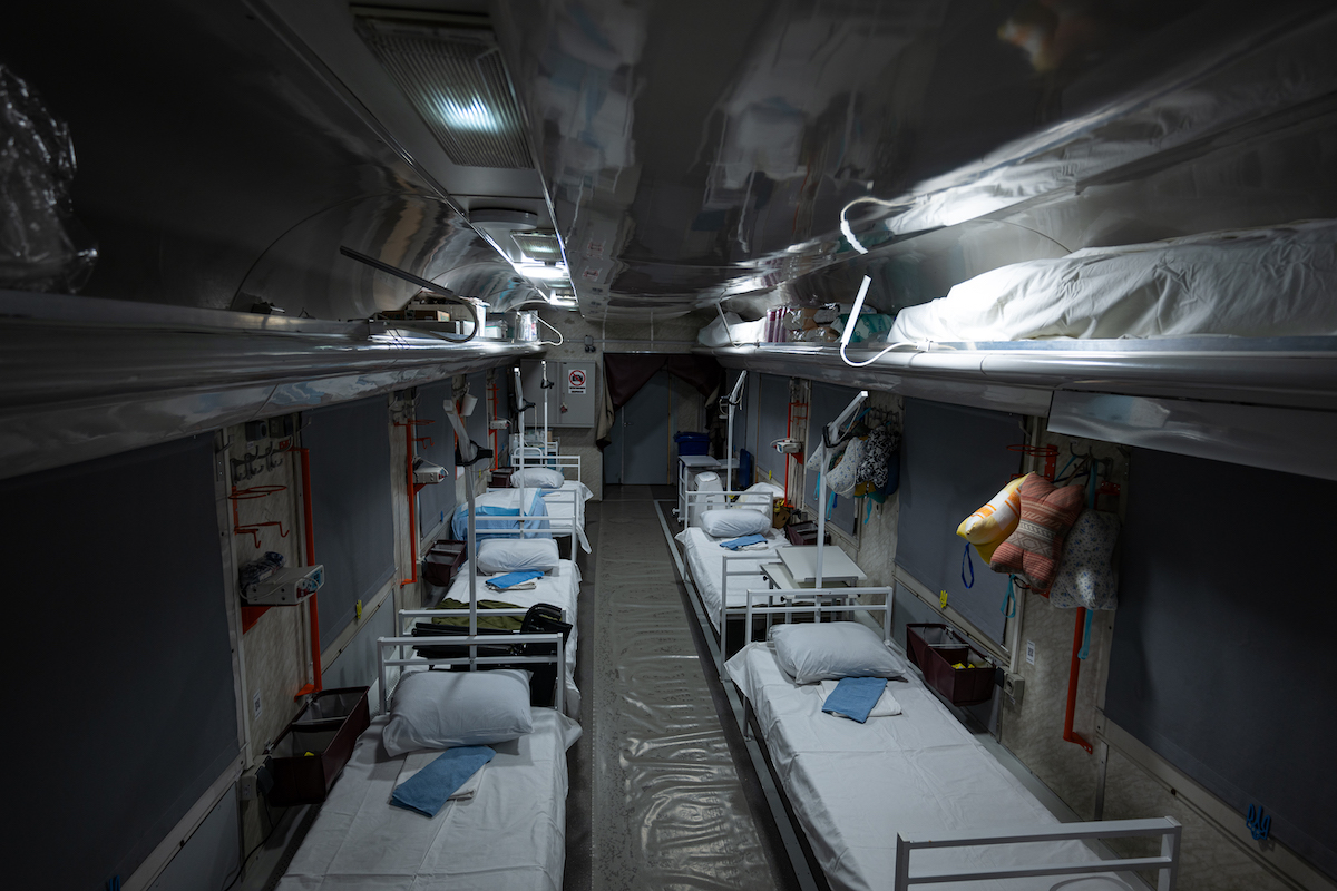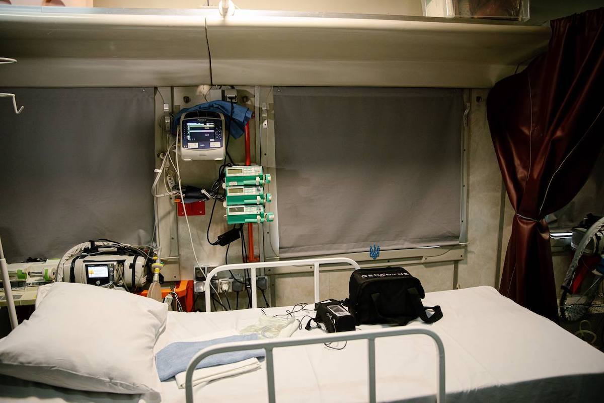 «Перший медичний вагон, який не має аналогів у світі, було створено на початку березня 2022 року. Тоді не існувало жодних креслень та технічної документації, але була велика потреба в таких вагонах. Залізничники й медики за чотири дні переобладнали перший такий вагон», — розповів голова правління Укрзалізниці Євген Лященко.