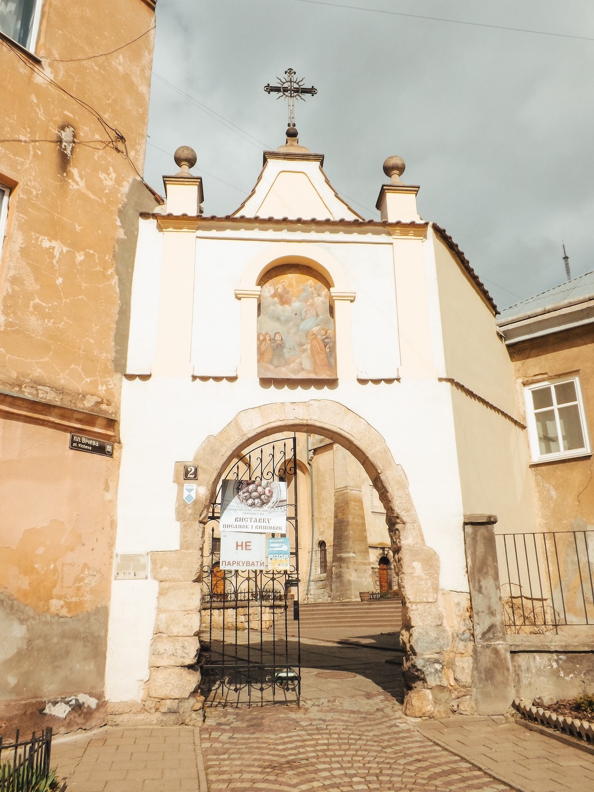 До подвір’я монастиря веде кам’яна брама з розписом XVIII століття. На фресках зображено Поклоніння Пресвятій Трійці та Архангел Михаїл, що поборює сатану. Цей іконографічний мотив був перемальований з картини італійського художника Гвідо Рені.