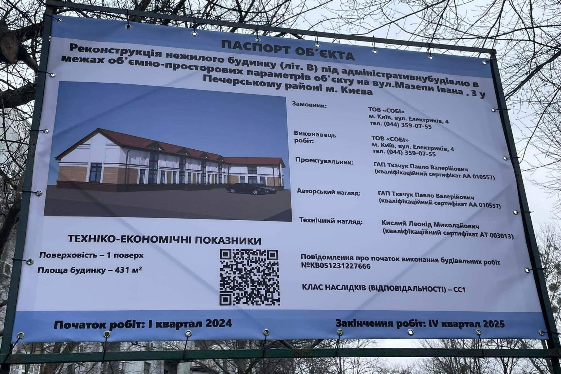 За твердженням активіста Дмитра Перова, під виглядом ремонтних робіт ТОВ «СОБІ» насправді розбирало фундаменти та здійснювало нове будівництво. Але 15 березня на місці робіт було змінено паспорт об’єкта, який усього за день до цього інформував про проведення капітального ремонту громадського будинку. Оновлений стенд вже зазначав про реконструкцію під адмінбудівлю. Швидку заміну паспорта об’єкта Перов коментував так: