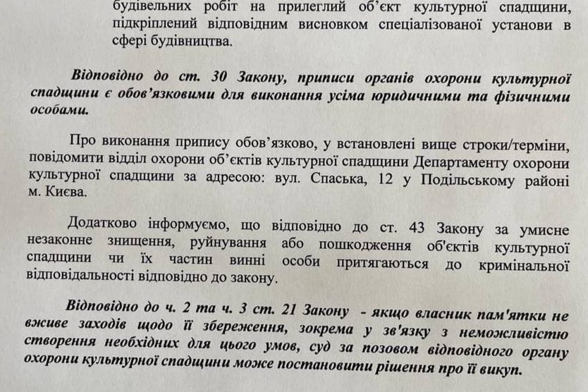 Для проведення будівельних робіт на цій території необхідно отримувати дозвіл у Міністерства культури. Але у приписі повідомляється, що інформація щодо погодження мінкультом, науково-проєктна документація та дозвіл на проведення робіт на згаданому об’єкті – відсутні у Департаменті.