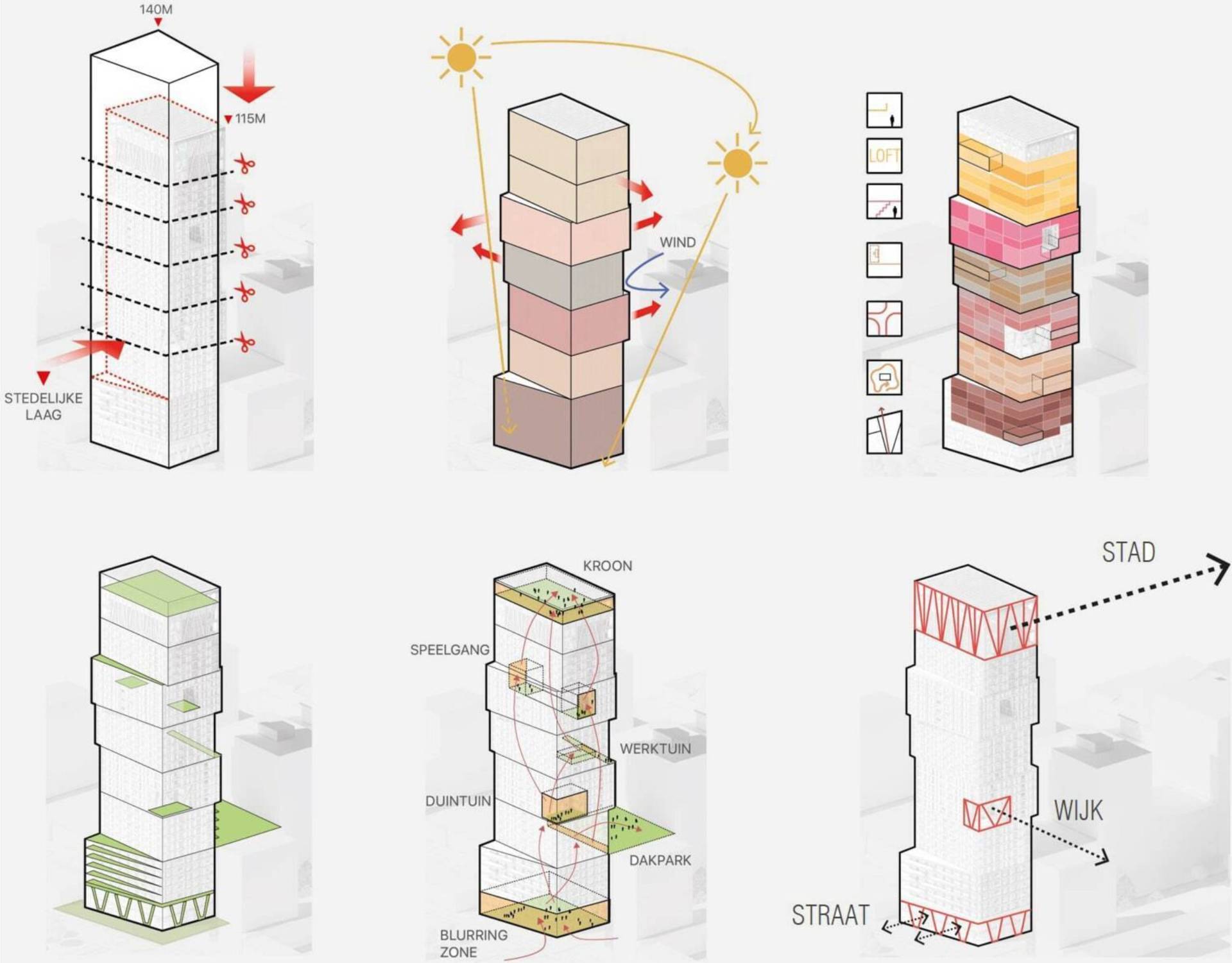 Комплекс буде поділений на шість мікрорайонів з унікальними рисами. Наприклад, у сімейному кварталі планується дитячий ігровий майданчик, а у більш тихій секції зроблять вихід на спеціально облаштовану територію з видом на місто. Поєднання різноманітних приватних і колективних просторів, спільного для всієї вежі парку на даху та громадського цокольного приміщення дасть кожному мешканцю можливість змінювати середовище відповідно до своїх потреб.