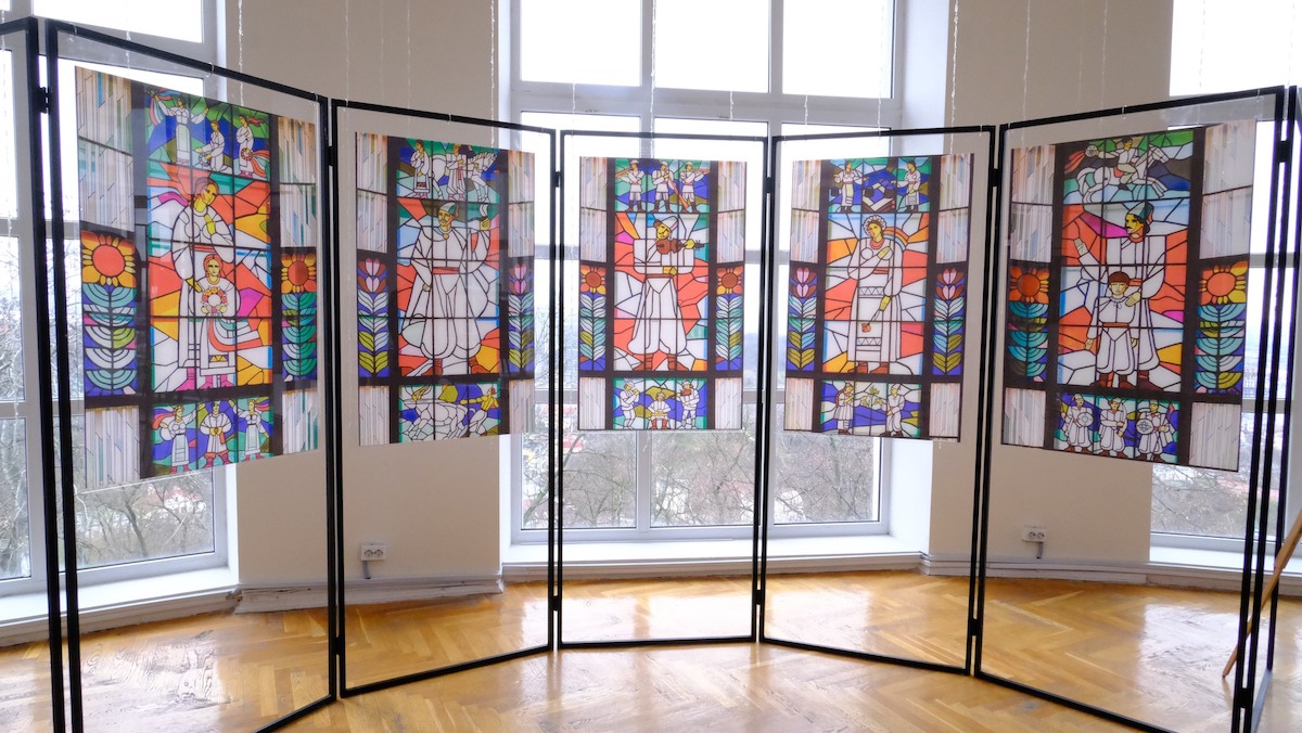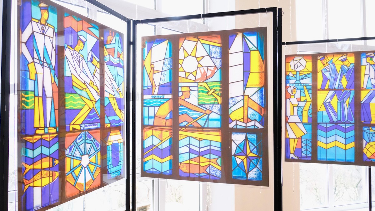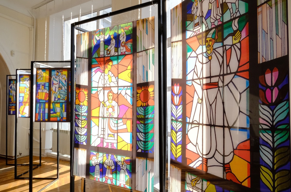 Світлини шести вітражів Маріуполя, знищених росіянами під час облоги, надрукувано на прозорому акрилі.