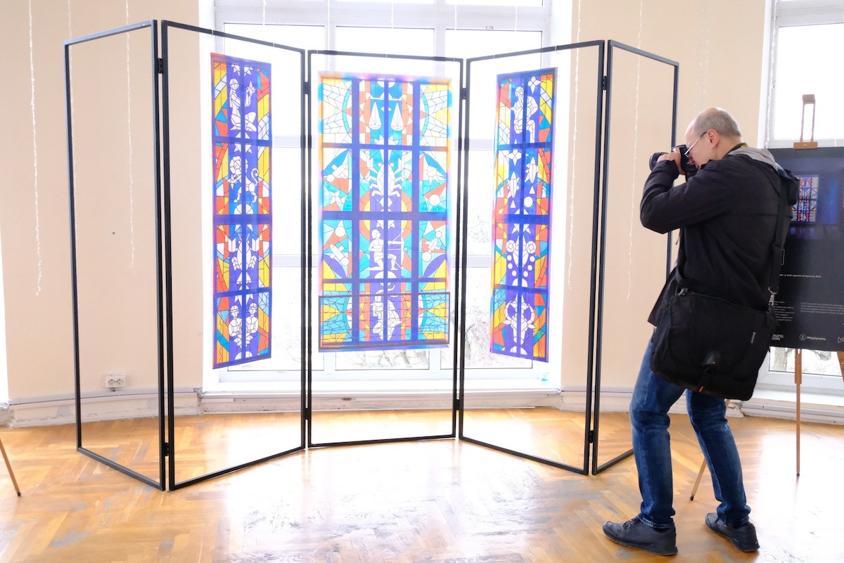 В експозиції — світлини шести вітражів Маріуполя, знищених росіянами під час облоги. Фото надрукувано на прозорому акрилі, що наближає експонати до фактури скла та посилює враження.
