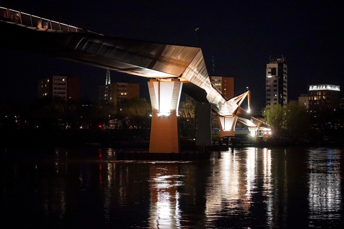 На відкритті не було ані стрічок, ані феєрверків. Однак міст прикрасили ілюмінацією, яка сяятиме до початку травня.