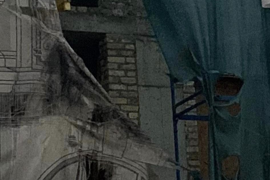 Будівельні риштування відкрилися через сильний вітер, який пошкодив ширму з фасадом на історичному будинку.