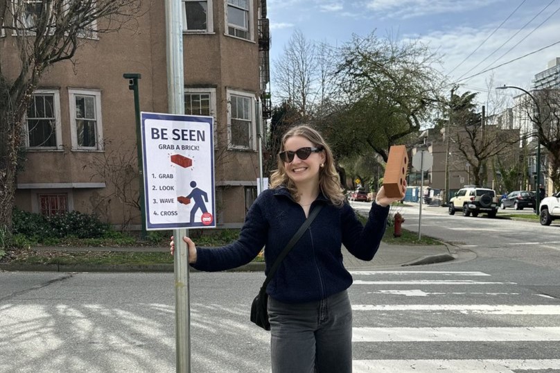 У канадському місті Ванкувер активісти організації Vision Zero Vancouver запустили проєкт з обладнання нерегульованих наземних переходів корзинками з цеглою. З обох сторін зебри на стовпи вішають спеціальні корзини, в які кладуть по кілька «цеглин», зроблених з пінопласту. Ідея полягає в тому, що якщо пішохід візьме цеглину і помахає нею перед автівками на переході, то вони зупиняться і пропустять людину з більшою імовірністю, оскільки відчуватимуть небезпеку для власного лобового скла.