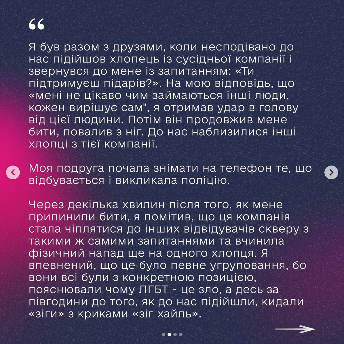 Напад, про який він згадує, — з небінарною людиною Сурікатом і його парнером Данилом — стався третього квітня на Березняках. Пара прямувала додому проспектом Соборності. Назустріч трапилася компанія з десяти людей, які стали вигукувати образи та переслідувати. Тікаючи, Данило викликав поліцію. Пара добігла до МакДональдса — зачиненого, але персонал був всередині, однак відмовився прихистити. У цей час добігли двоє з нападників і почали завдавати ударів. Хтось із присутніх на вулиці людей заступився за постраждалих.