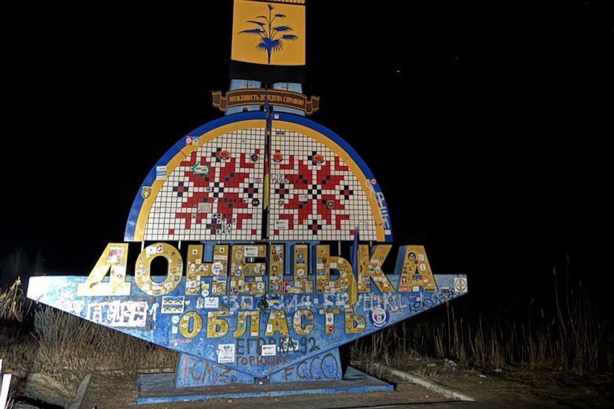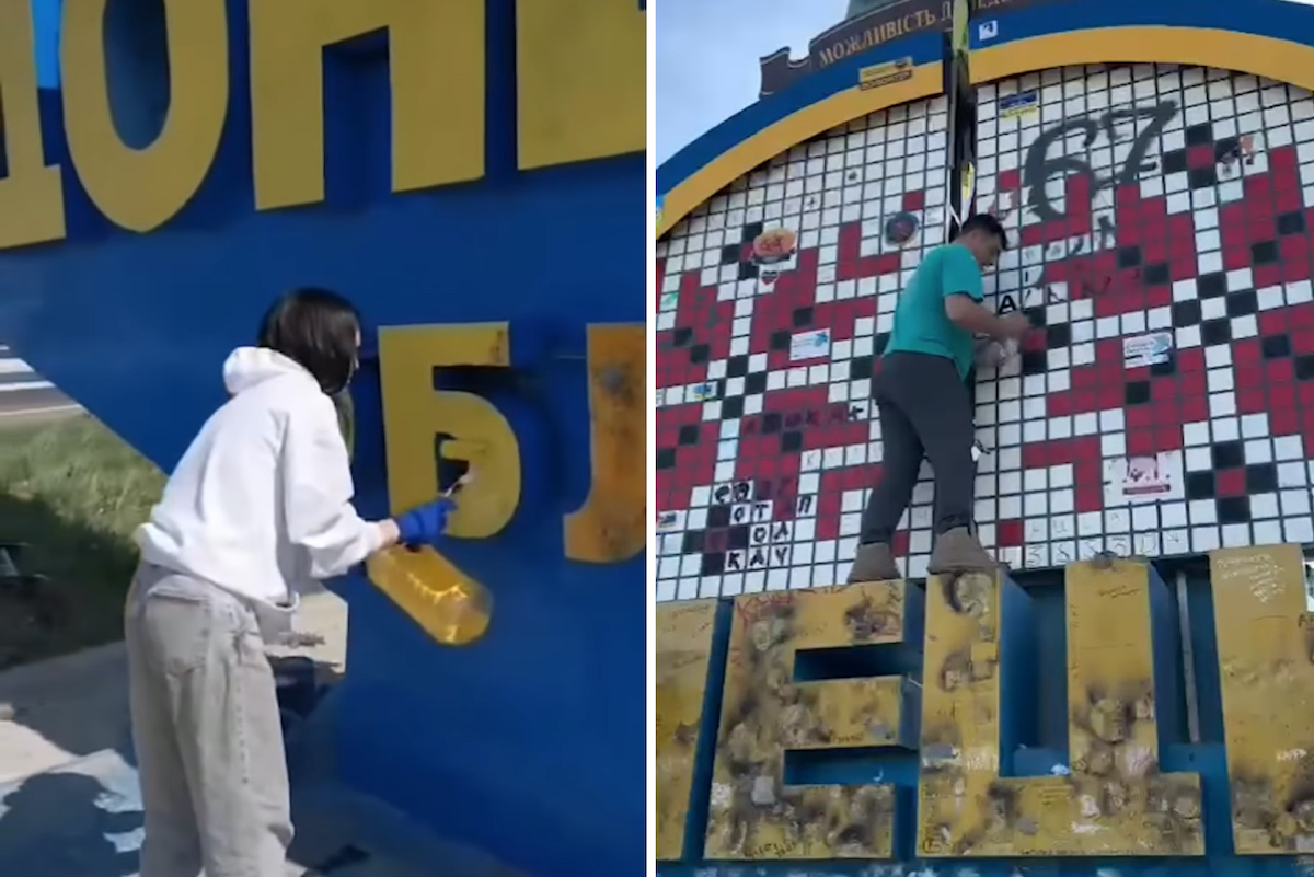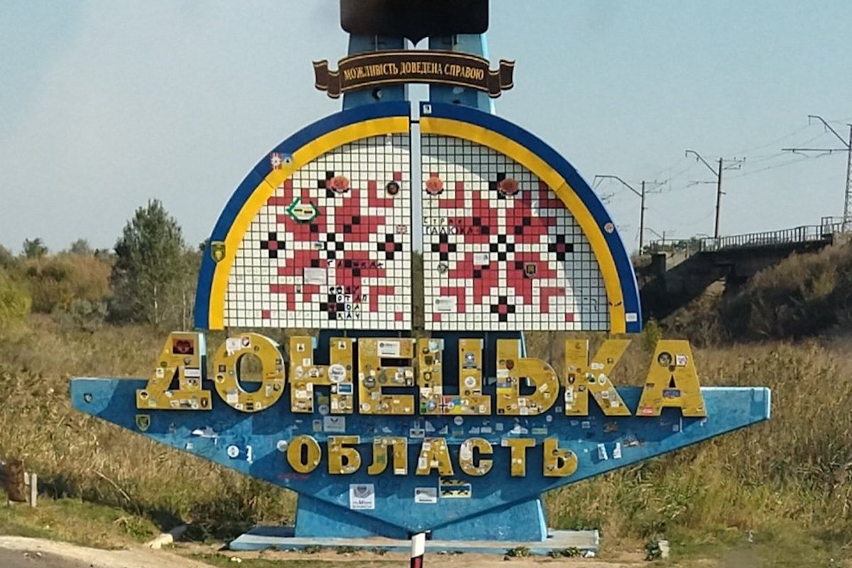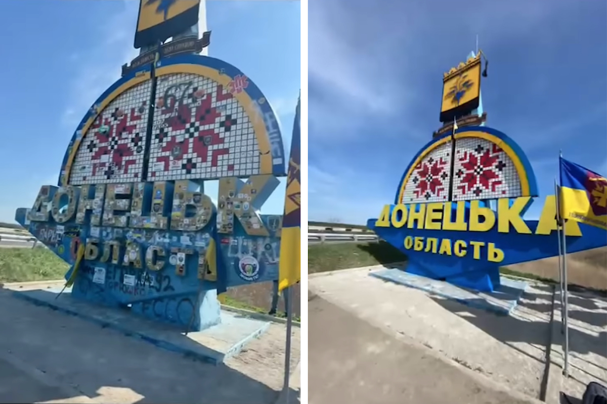 Група волонтерів відчистила стелу на в’їзді до Донецької області від підписів і наліпок, залишених військовими, та перефарбувала конструкцію.