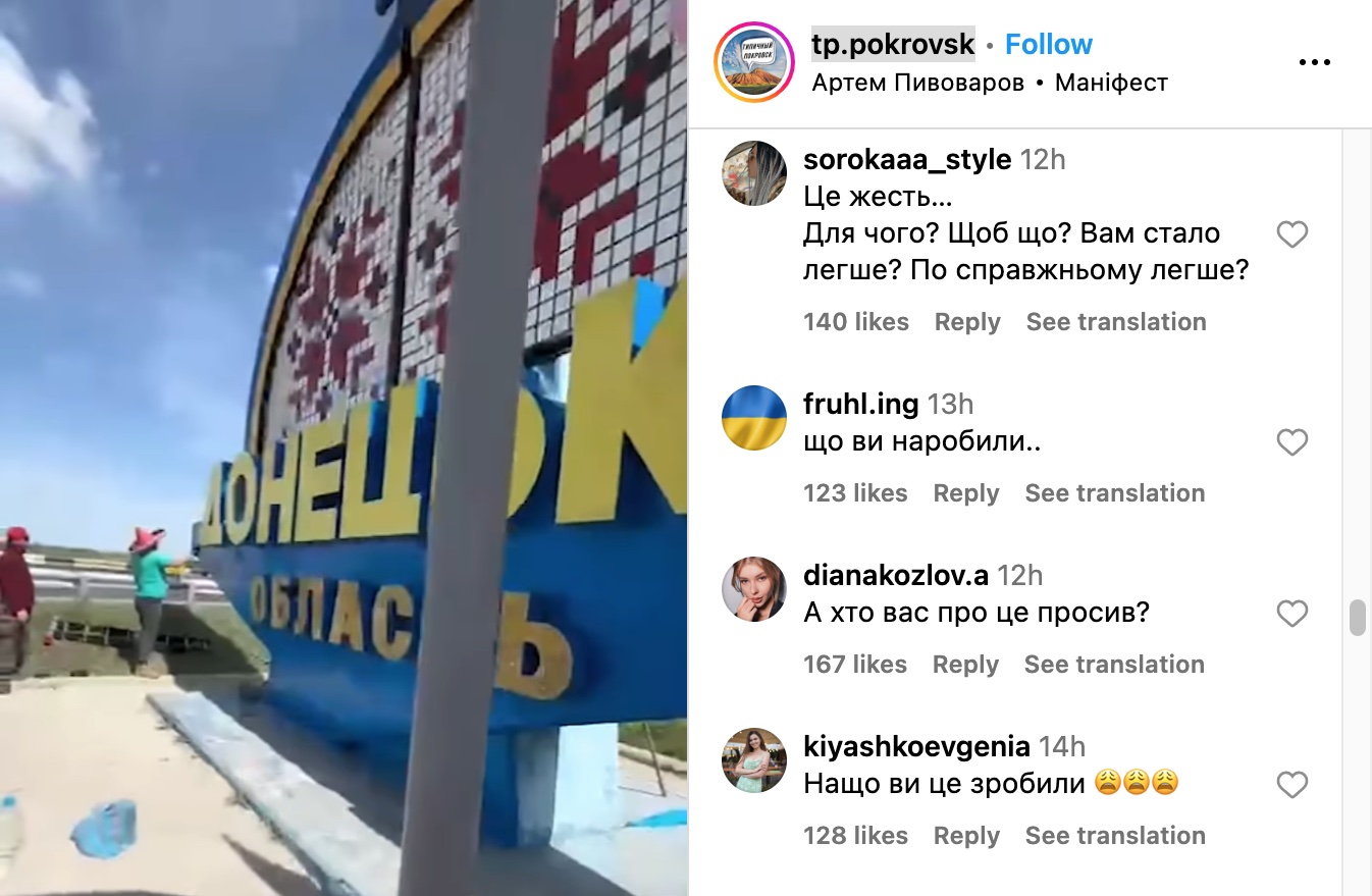 «Мені боляче. Це був пам’ятний знак з надпотужним сенсом та історією, а не просто повідомлення про в’їзд в область. Там були підписи наших побратимів, яких уже нема в живих», — пише бойова медикиня добровольчого батальйону «Госпітальєри» Ірина Цибух.