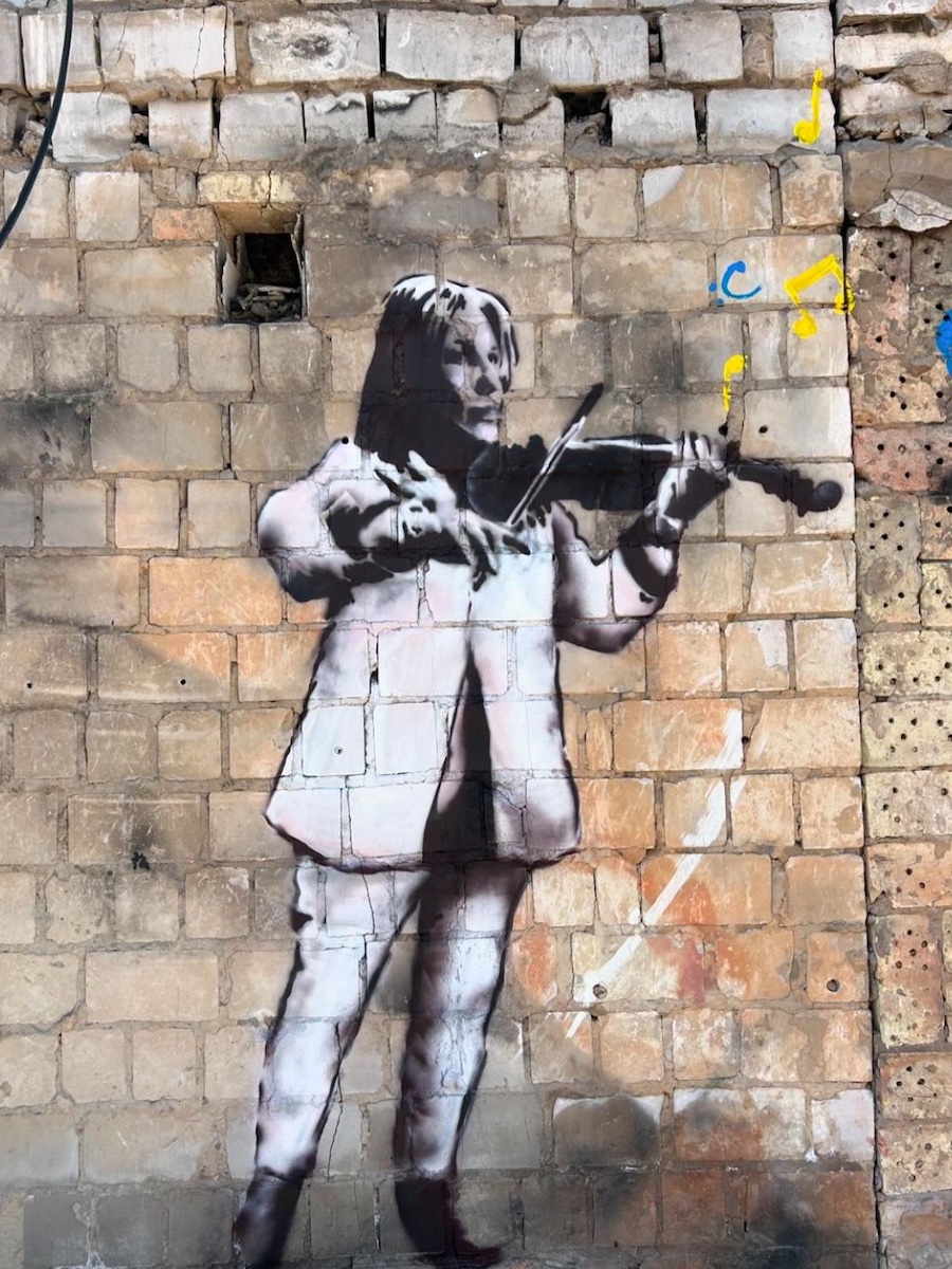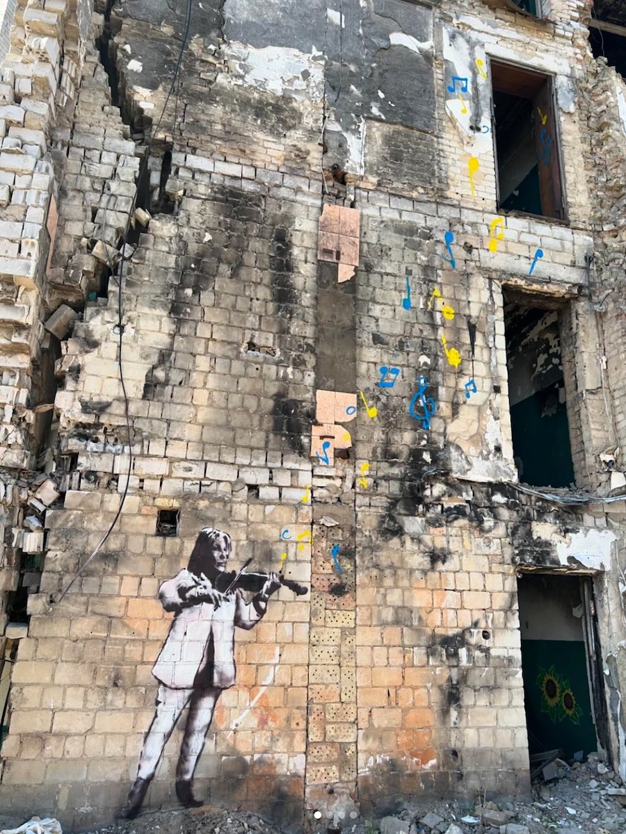 Ці ж американські художники створили на будинку в Бородянці портрет скрипальки, змальований з Єлени, переселенки з Харківщини. Зруйнований росіянами будинок демонтують, тож зображення тимчасове.