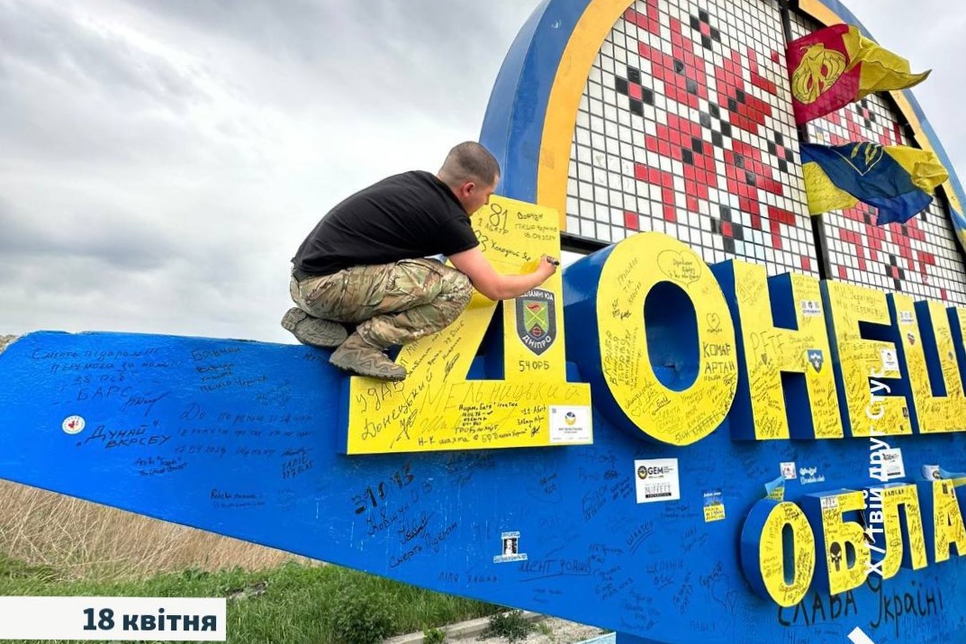 На стелі на в’їзді у Донецьку область знову з’явилися підписи та наліпки, які залишають військові. До цього група активістів відчистила та перефарбувала споруду, що викликало хвилю обурення у соцмережах.