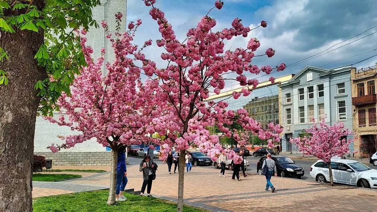 На площі Калічанській у Вінниці розквітли сакури. Кілька років тому на цьому місці була автомобільна парковка. Фото опублікував радник міського голови з питань сталої мобільності Віктор Перлов.