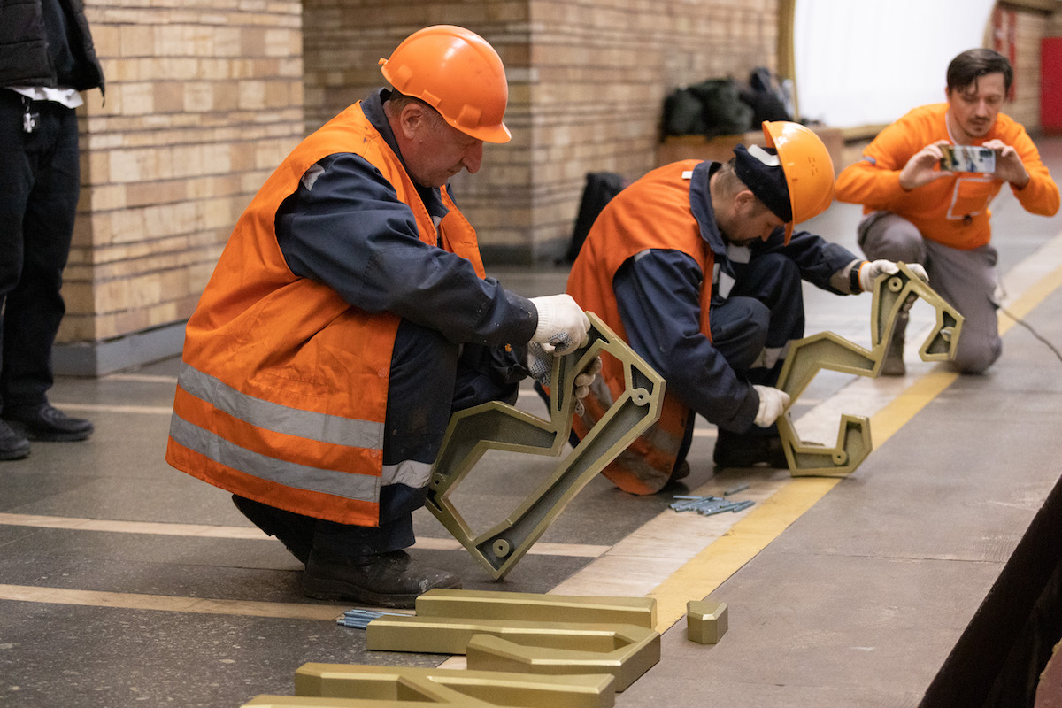 Написи встановлюють лише вночі, коли відсутній рух поїздів та напруга на контактній рейці. Минулої ночі змонували два комплекти з чотирьох.