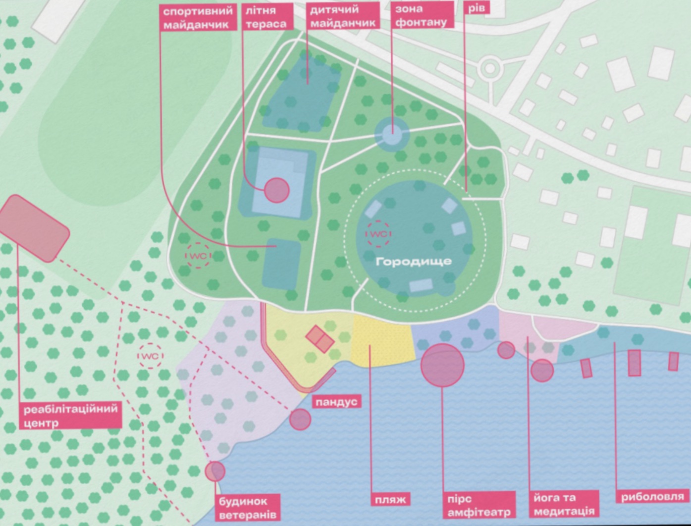 На території передачать місця для сидіння та вогнища, де можна готувати їжу, влаштовувати групові зустрічі, камерні концерти, майстер-класи тощо.