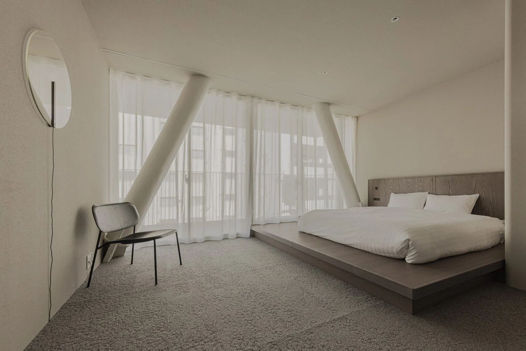Для інтер’єрів 14 номерів готелю обрали палітру сірих кольорів, яка доповнює забарвлення фасаду, максимізує ефект природного освітлення та підкреслює тіні увігнутих частин балконів. Адже на думку співзасновниці студії, світло-сірий колір пом’якшує відтінки природного світла краще, ніж білий. Щоб підібрати сірий відтінок стін і підлоги Kooo Architects використали ясен.
