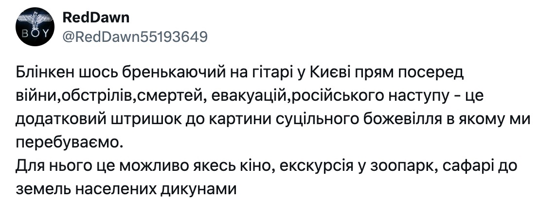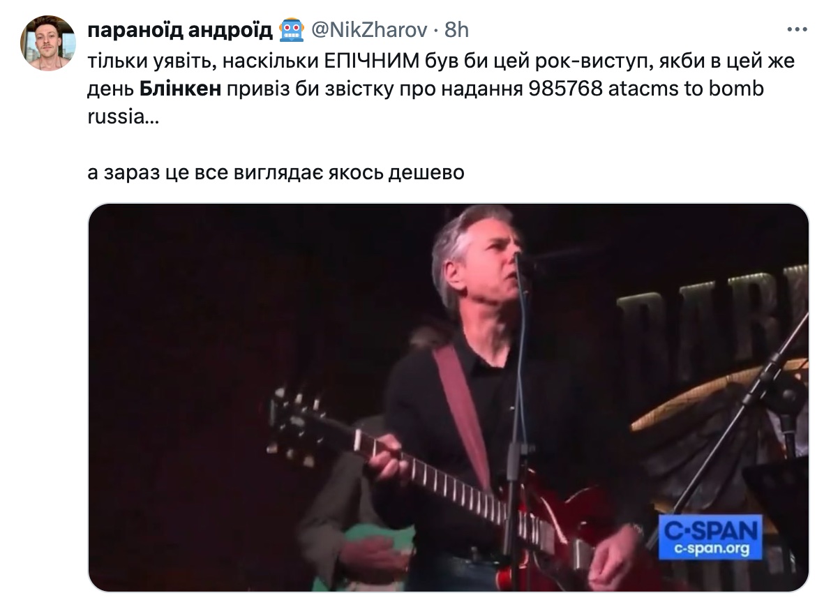Гра Блінкена на гітарі викликала чимало критики на тлі затримки з наданням США військової допомоги.