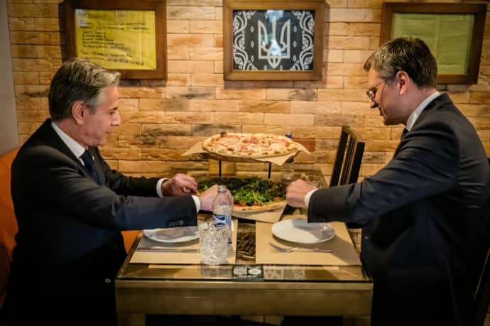 Перед цим Блінкен пообідав із міністром закордонних справ України Дмитром Кулебою в київській піцерії Veterano Pizza. Вони замовили піцу «Українська».