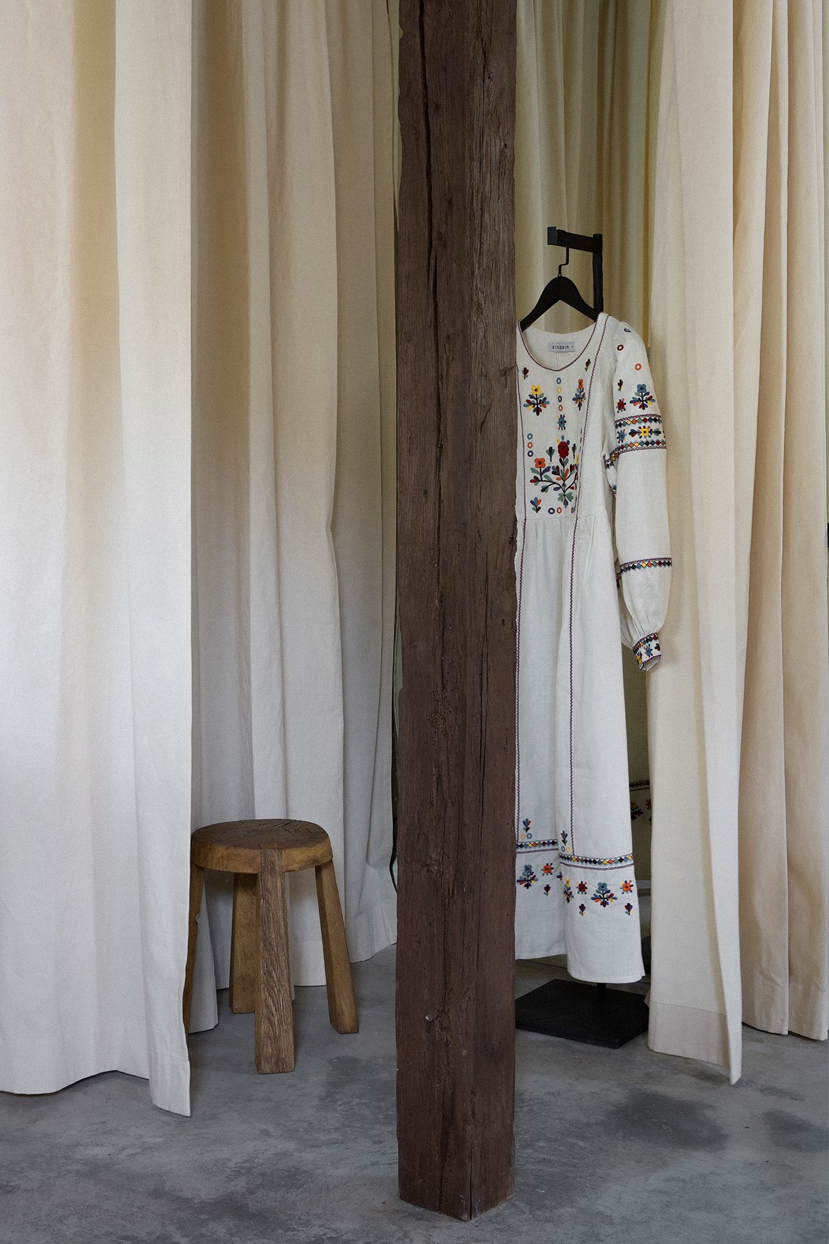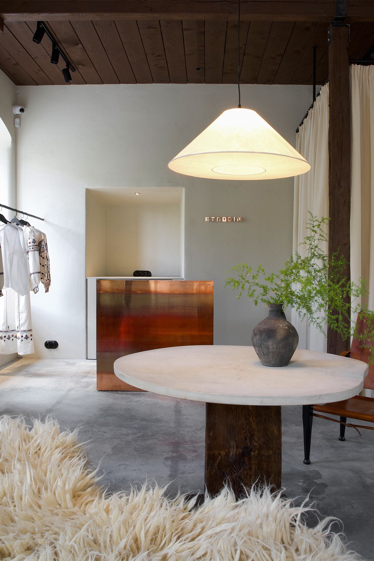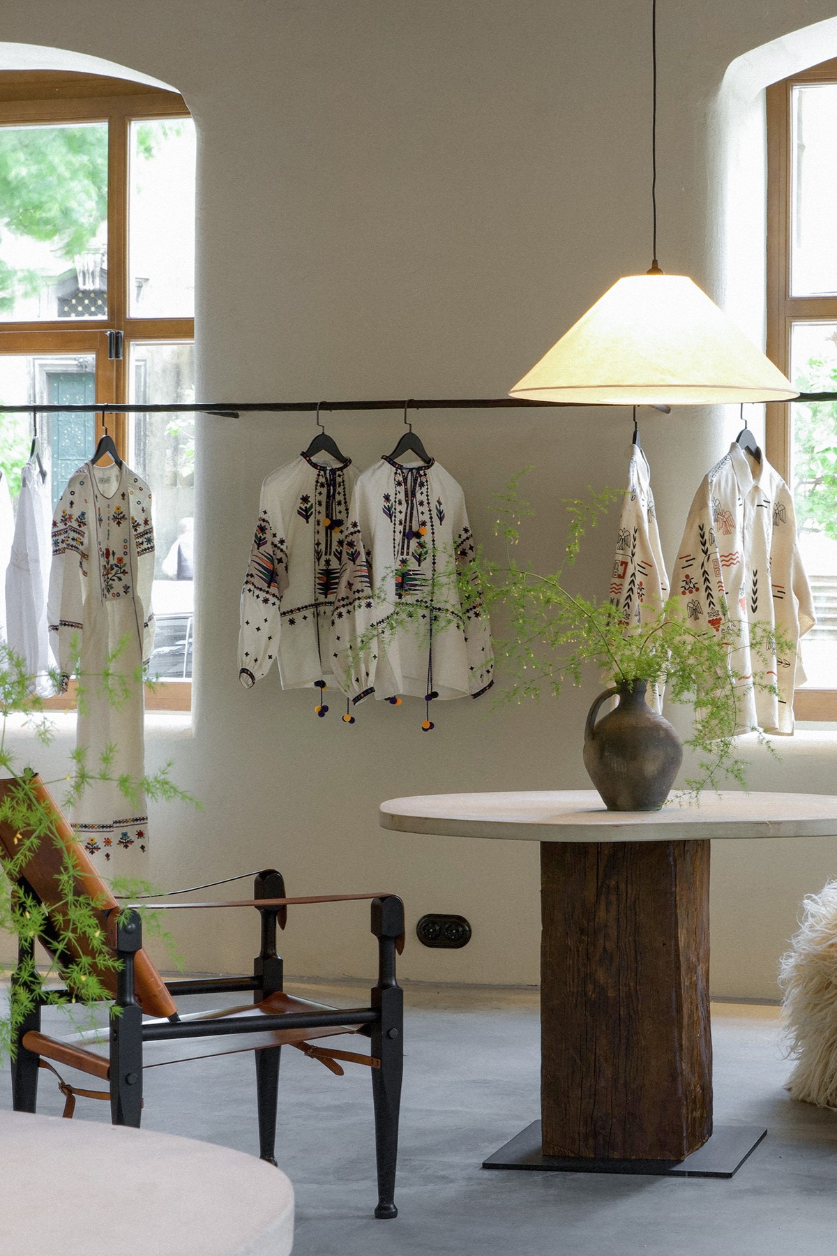 Кожен матеріал та фактура в новому магазині Etnodim є фоном для вишиваних виробів: стіни нагадують хату-мазанку, а стільці-пуфики відсилають до баранців з полонини. Таким чином етнічний продукт, який зберігся дотепер, набуває нових сенсів у діалозі бренду з минулим.