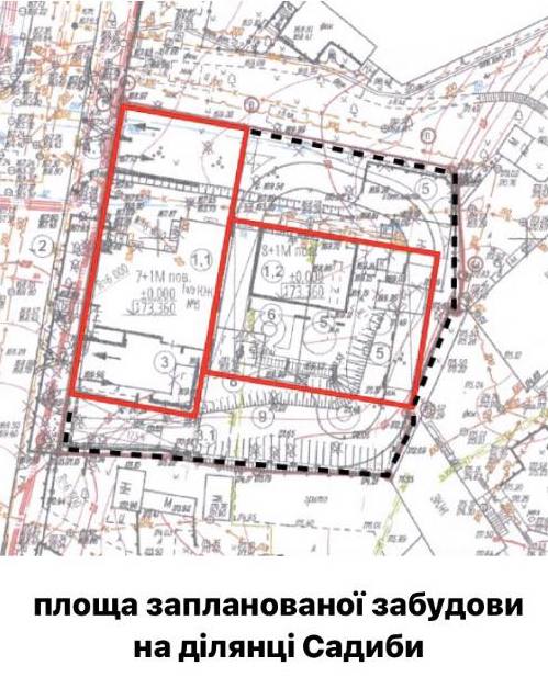 Новобудова також займатиме практично всю площу ділянки, не залишаючи місця для двору та дерев. Група нагадує, що забудовник вирубав 38 дерев.