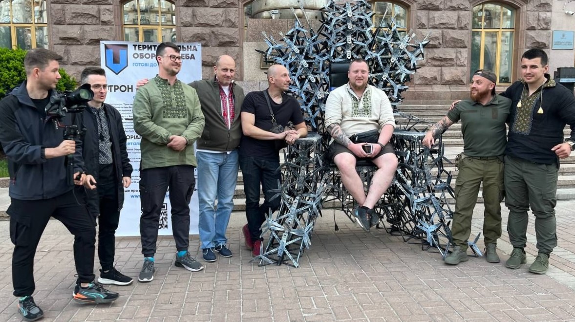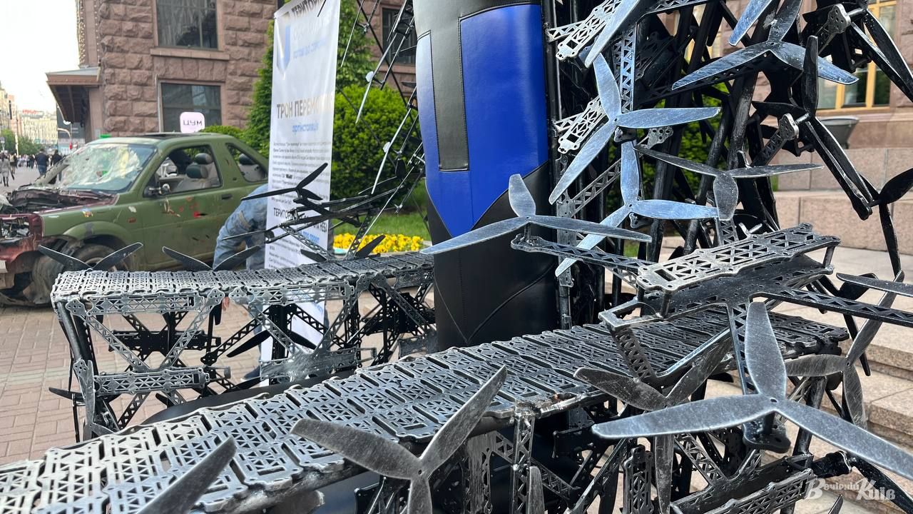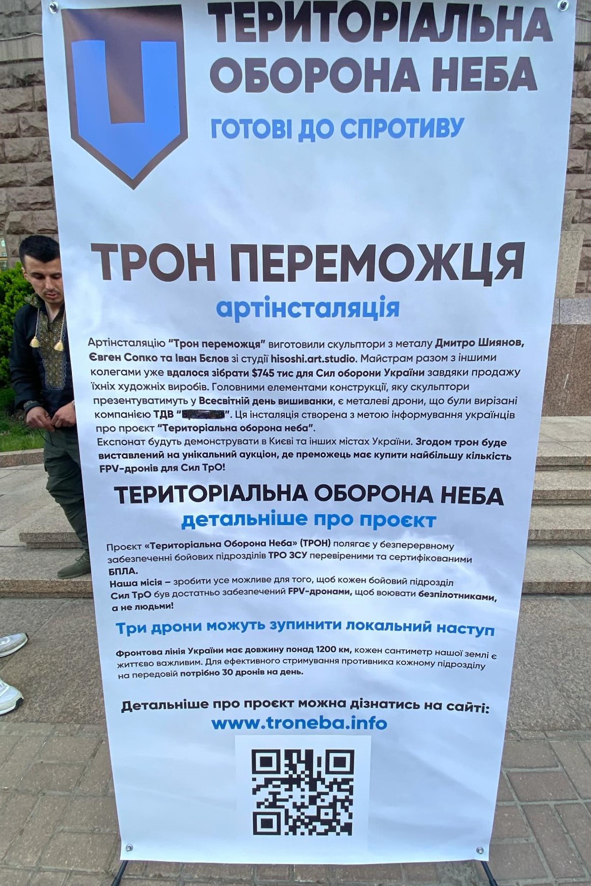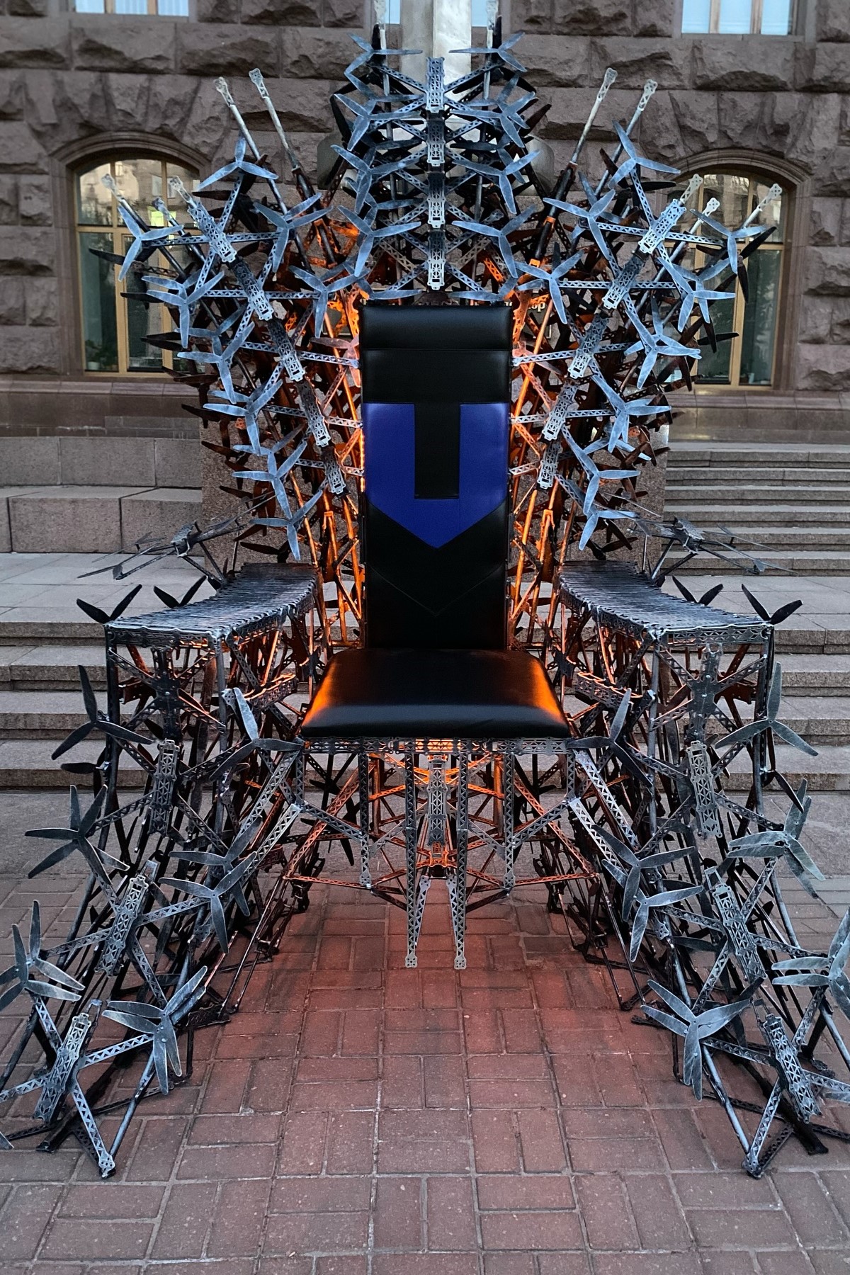 На Хрещатику біля КМДА команда «Територіальної оборони неба» встановила артінсталяцію, щоб надати розголос проєкту і зібрати кошти на FPV-дрони. Металева конструкція у вигляді трону зроблена зі спеціально виготовлених для цього дронів.