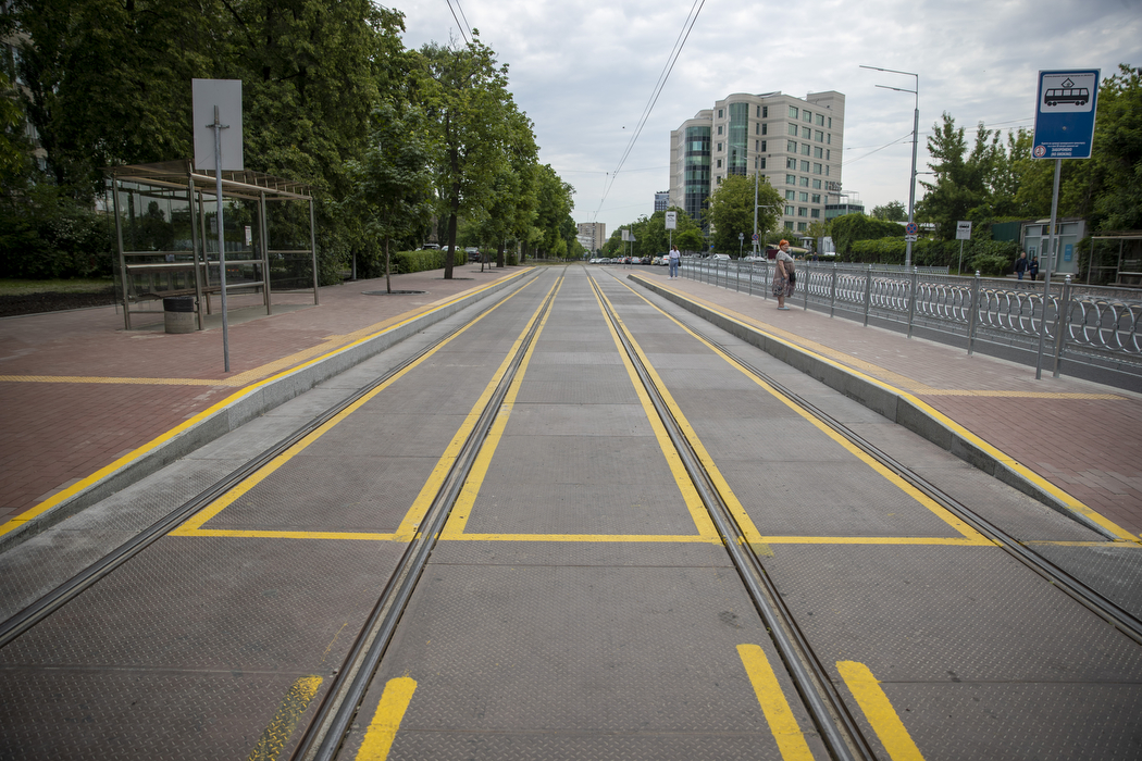 Під час реконструкції реконструювали ділянку трамвайної лінії. Відокремлене трамвайне полотно облаштували з посилених монолітних плит, що сприяють поглинанню шуму, а також зробили підняті над рівнем тротуару «віденські» зупинки.