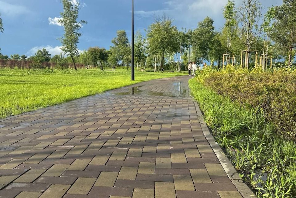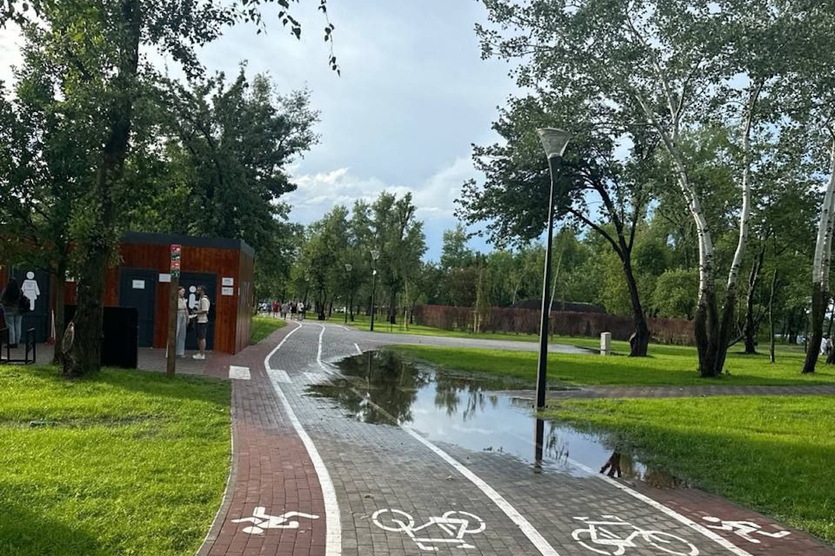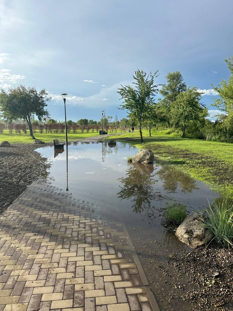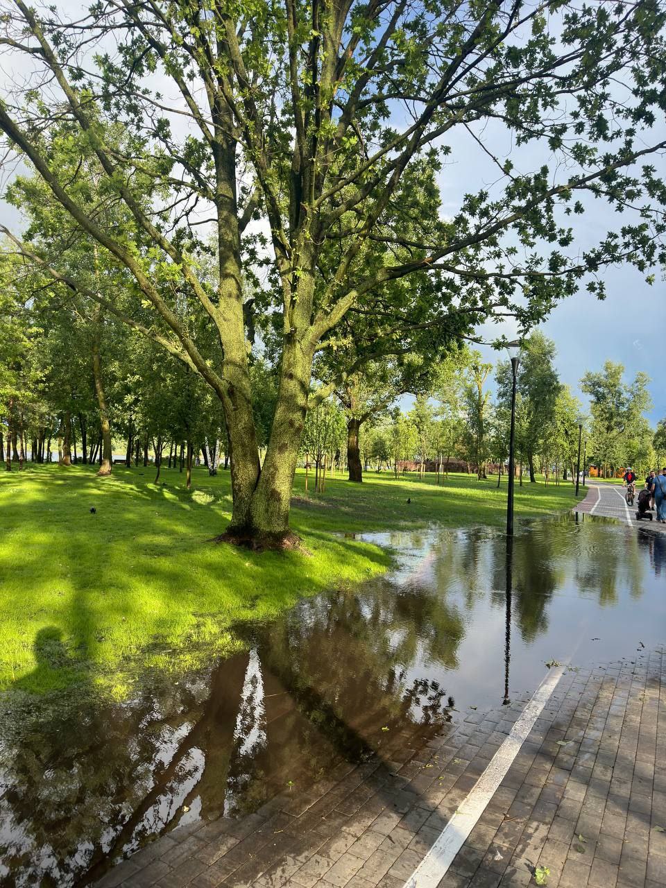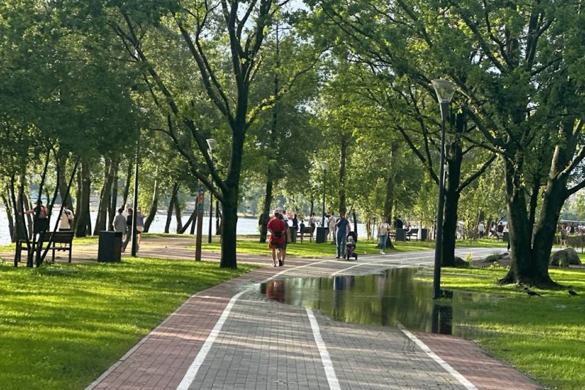 Після зливи великі калюжі утворилися на доріжках нової відпочинкової зони на Оболонському острові, яку відкрив міський голова Віталій Кличко до Дня Києва, разом із мостом-хвилею. Фото зробив підписник телеграм-каналу Націонал-Урбанізм.