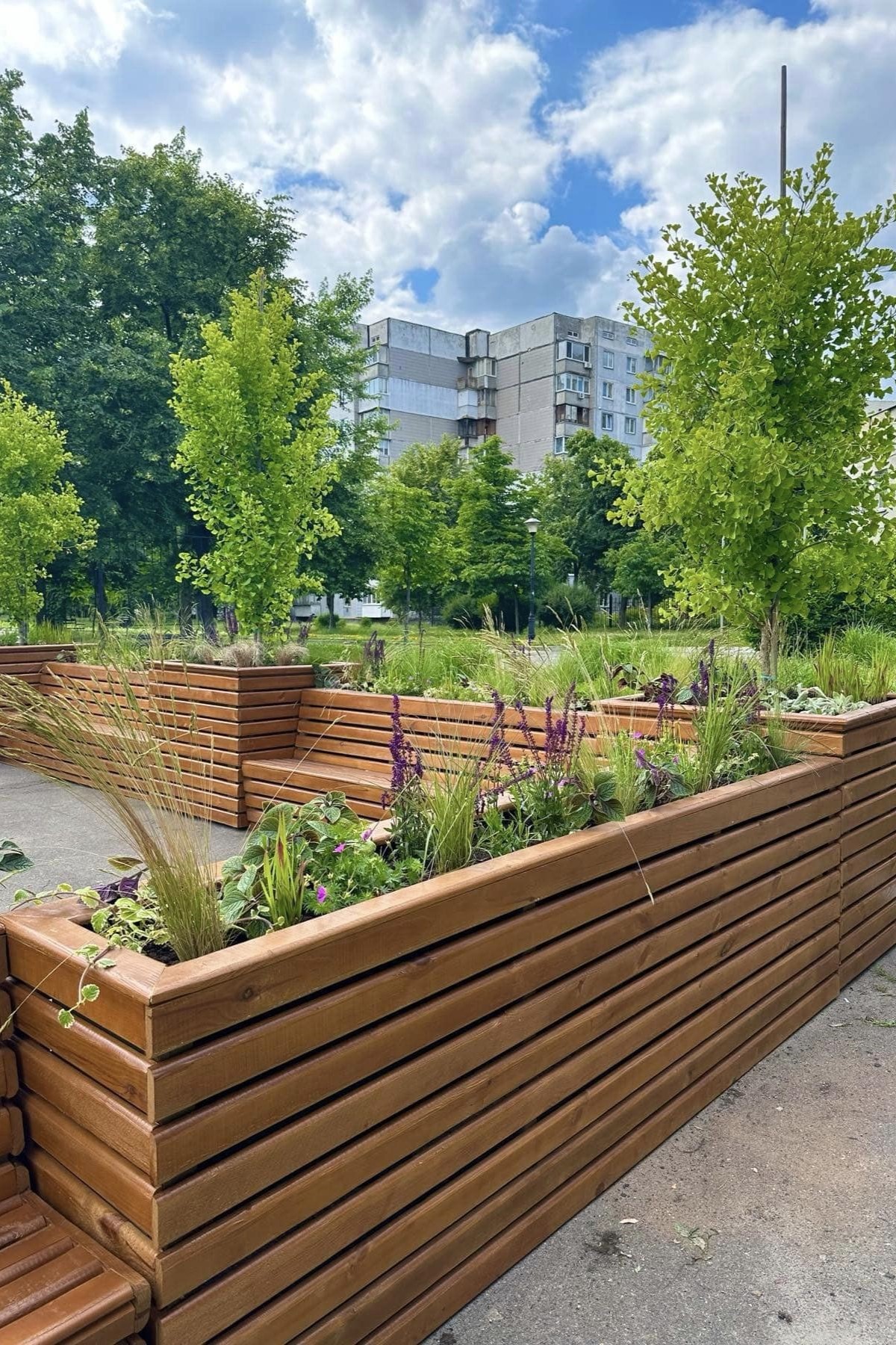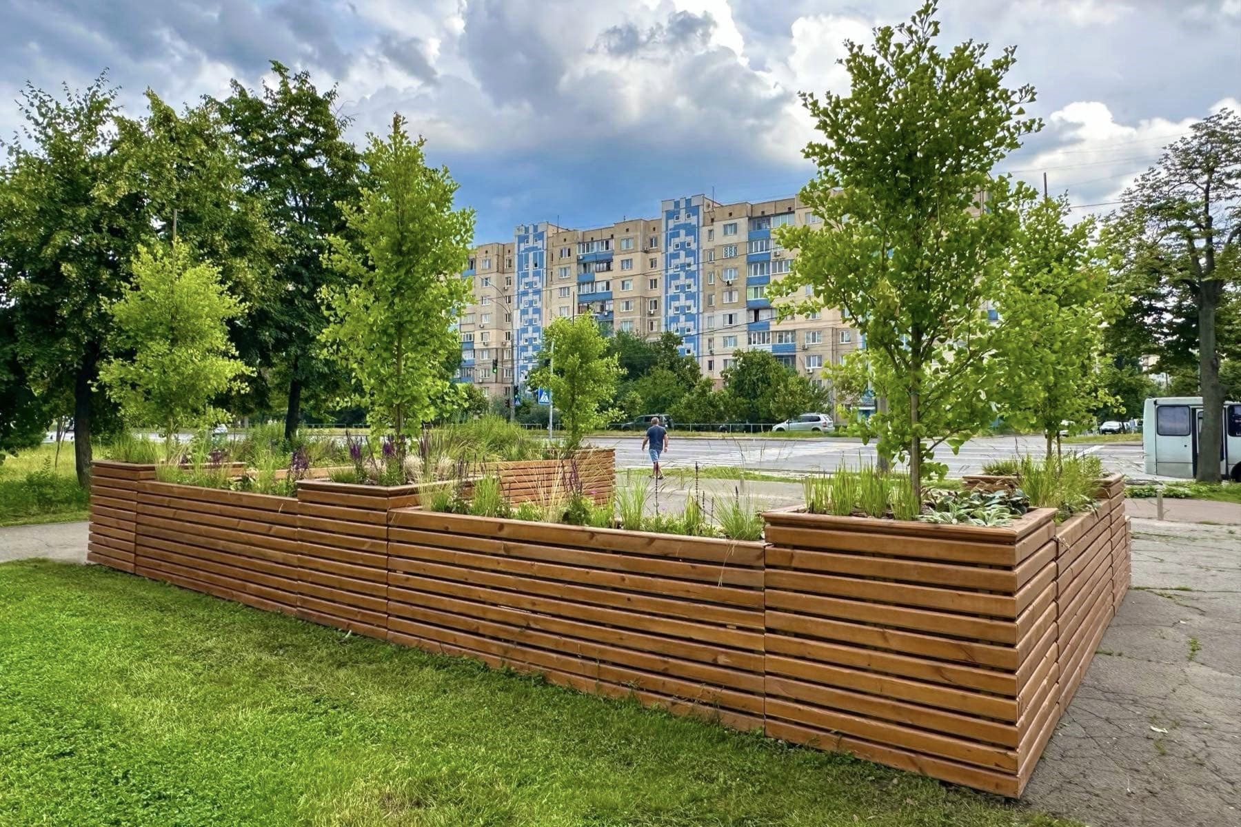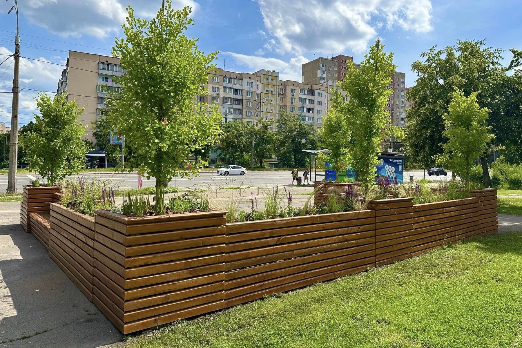 У Деснянському районі Києва з’явився новий парклет. Простір з зеленими насадженнями облаштували вздовж просп. Червоної Калини в парку «Фестивальний». Як зображено на фотографіях, конструкцію розмістили на місці, де раніше паркувалися авто. Водночас перед парклетом також облаштували антипаркувальні стовпчики.