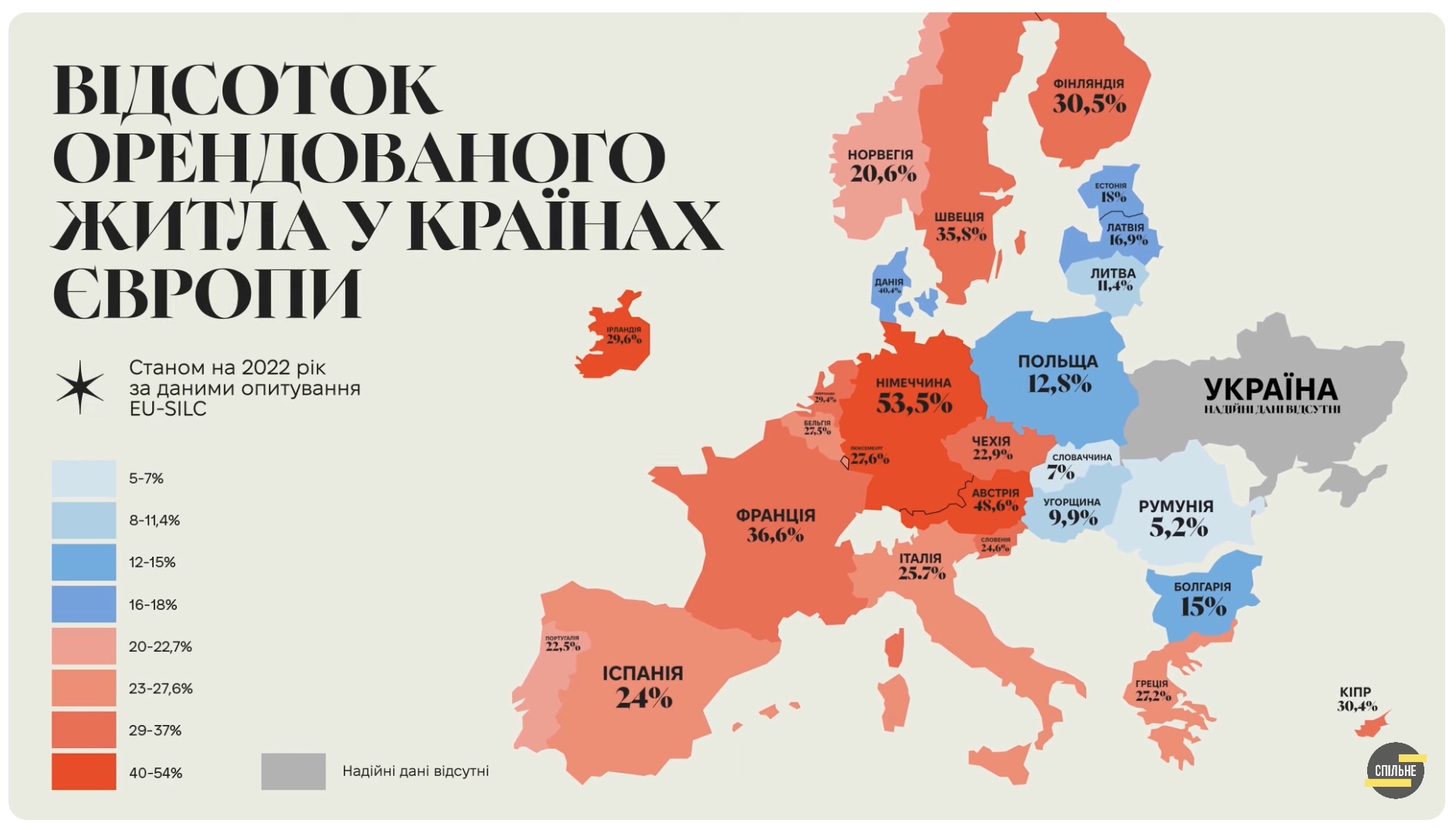 Відомо, що в Україні велика частка житла у власності, однак щодалі це співвідношення змінюється. За даними Держстату за 2021 рік, в Україні в оренді перебувало 5% житлового фонду. Однак опитування, проведене у 2022 році центром CEDOS, показало, що 16% респондентів винаймають житло.