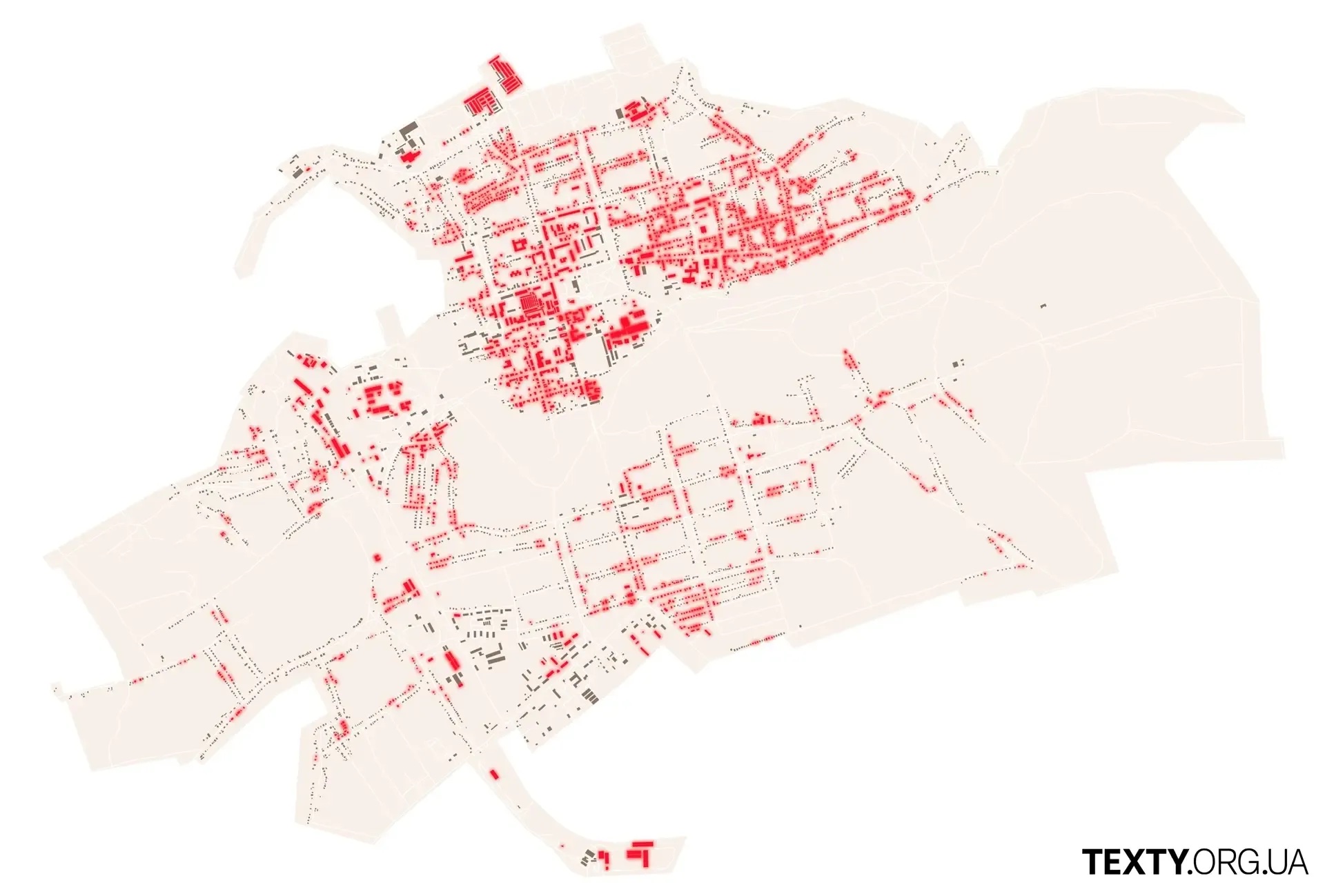 Журналісти видання наклали шар із будинками на теплову карту пошкоджень у місті, отриману за допомогою аналізу супутникових знімків Sentinel-1. За підрахунками, протягом травня понад дві тисячі будівель були повністю або частково зруйновані.
