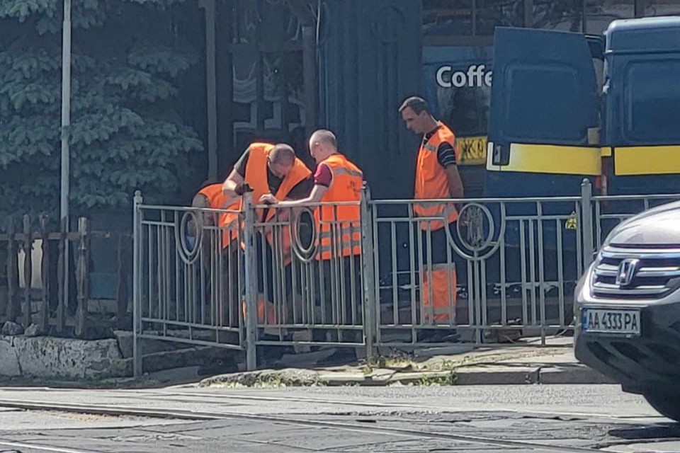 Комунальники встановлюють паркан для перекриття проходу через дорогу. Фото: «Пасажири Києва»
