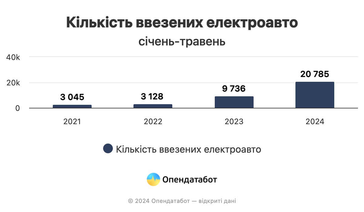 За п’ять місяців цього року в Україну було ввезено рекордну кількість електромобілів — 20,8 тисячі, повідомляє Опендатабот.