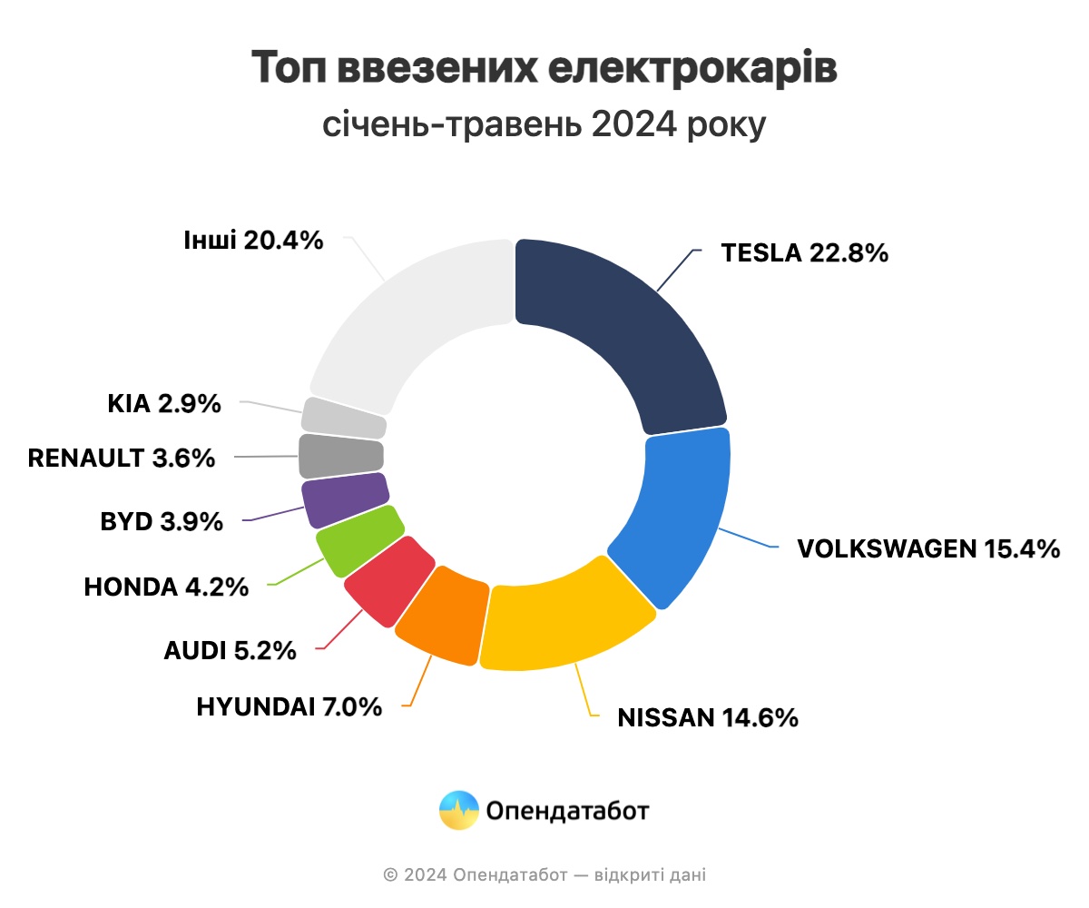 Найпопулярнішими моделями є Nissan Leaf, Tesla Model 3 та Volkswagen ID.4.