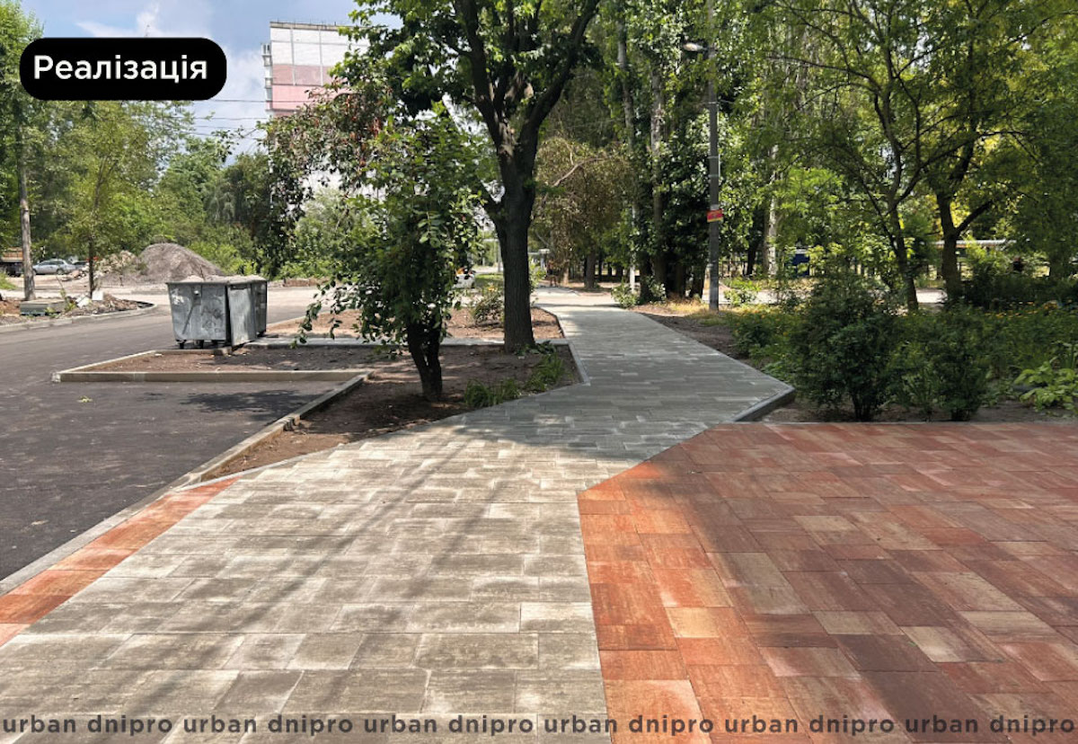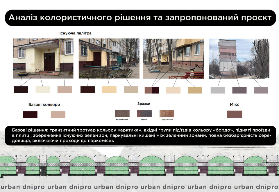 Засновник Urban Dnipro Руслан Ширінов зауважує, що хотілося підкреслити ідентичність району колористичним рішенням. Тому проаналізували кольори фасадів, виокремили базові та, відповідно, позначили простір вхідних груп і елементів благоустрою бордовим кольором.