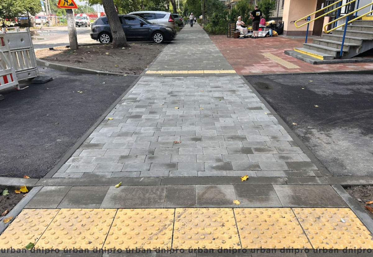 Тротуар розширили з 1,90 метра до 2,25 метра. Облаштували пониження та тактильну плитку. Зберегли наявні паркувальні кишені «ялинкою».