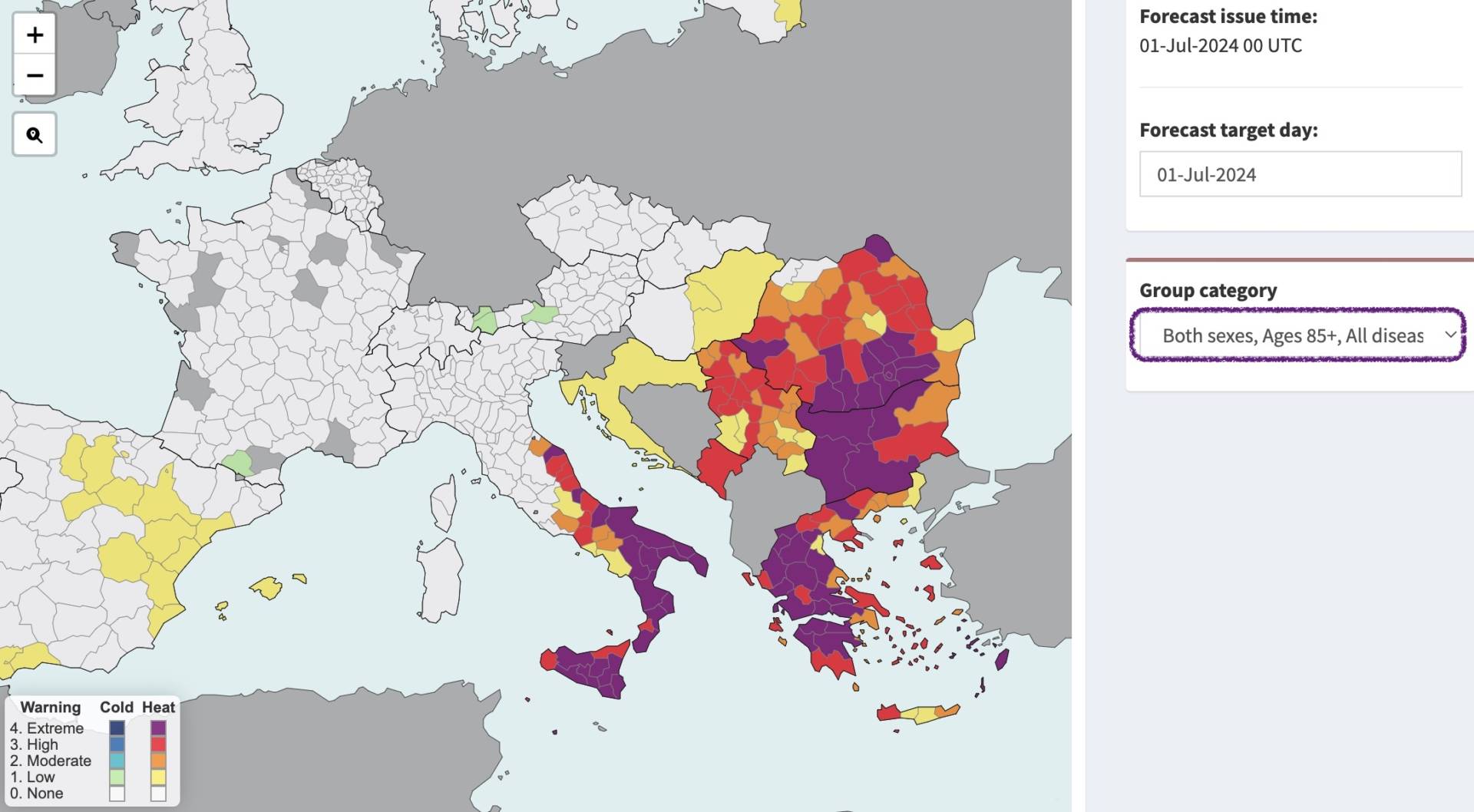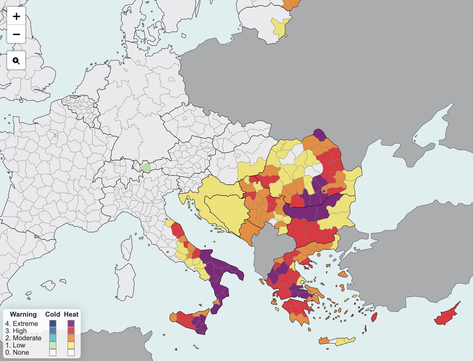 Станом на перше липня «екстремальний» рівень попередження є для півдня Румунії та півночі Болгарії (з епіцентром у Бухаресті, де від початку літа тримається 35-градусна спека), для Греції, а також для півдня Італії.