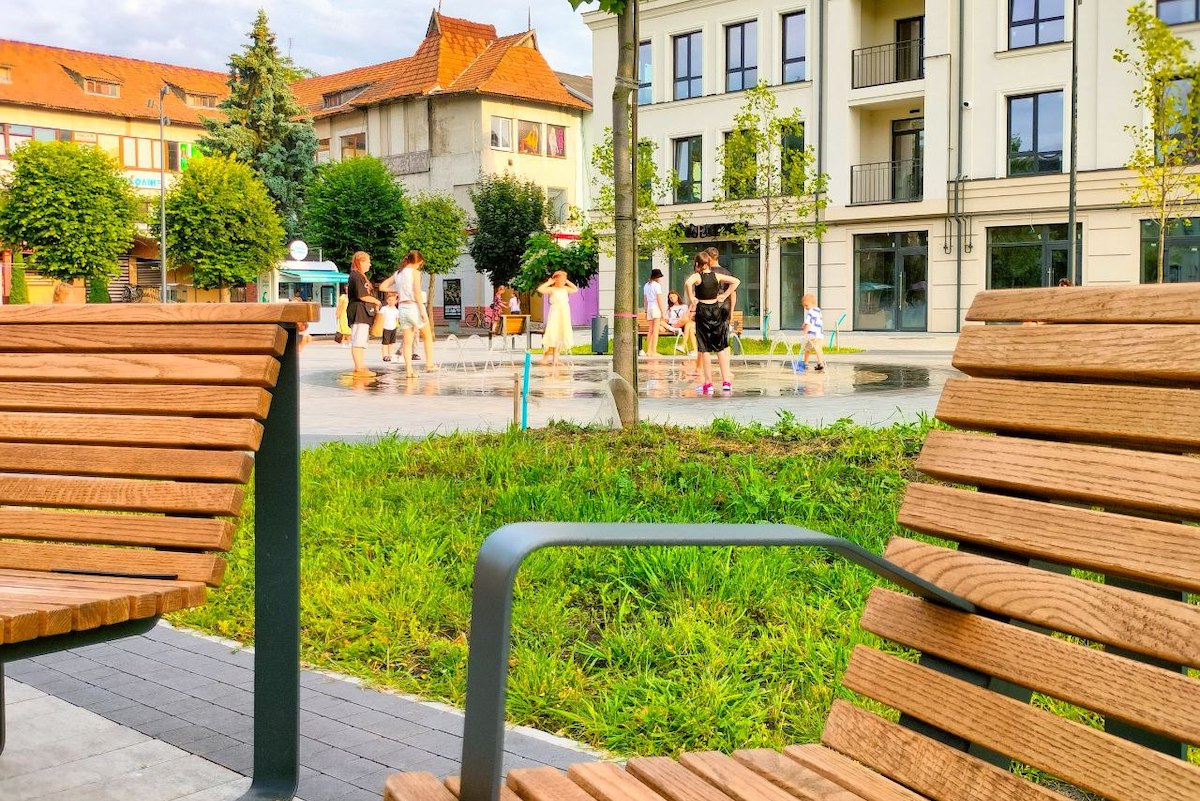 На площі встановили сухий фонтан. Для мощення використали безфаскову плитку двох кольорів. Усі кути — заокруглені.