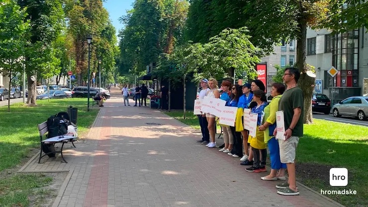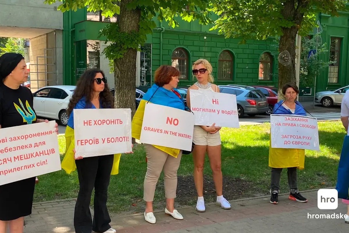 Із десяток людей, які сказали, що є жителями навколишніх сіл Мархалівка та Іванівка, стояли з плакатами «Не хороніть героїв у болоті», «Ні могилам у воді», «Масові захоронення — небезпека для тисяч мешканців прилеглих сіл» перед будівлею Інституту національної памʼяті.
