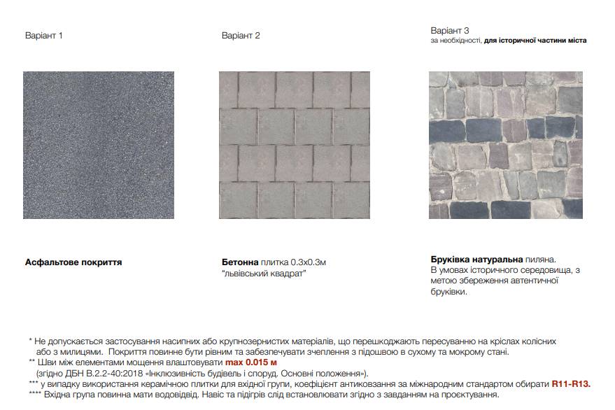 Покриття пішохідних доріжок, тротуарів і прилеглої території рекомендують зробити однорідним та забезпечити хороше зчеплення з підошвою в сухому та мокрому стані. А у випадку використання керамічної плитки радять враховувати коефіцієнт антиковзання. Не допускається застосовування насипних або крупнозернистих матеріалів, що перешкоджають пересуванню на колісних кріслах або з милицями.