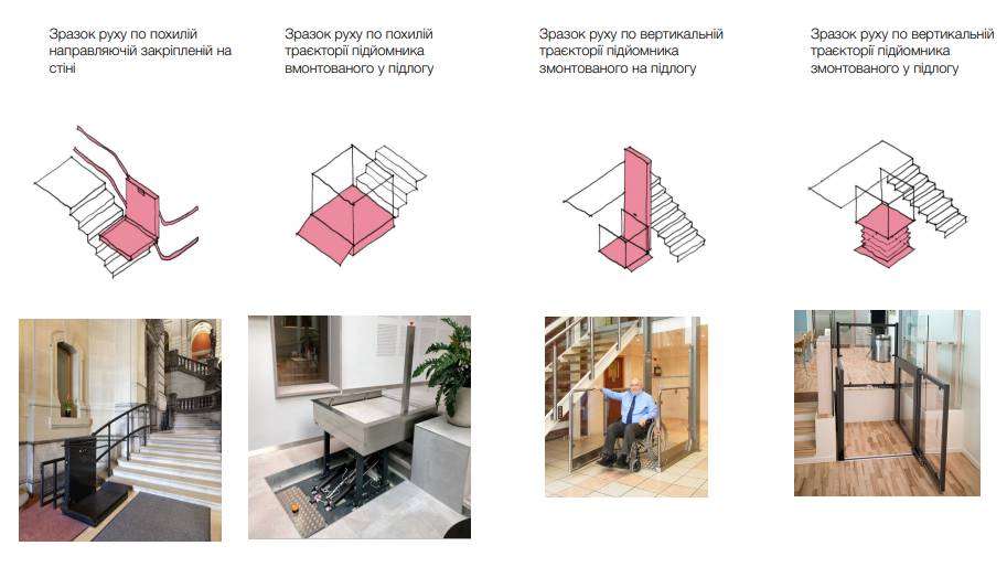 Щодо підйомників, то їх вважають додатковим елементом доступності та рекомендують облаштувати лише у випадках, коли неможливо встановити пандус. Підйомник має бути таким, щоб людина могла користуватися ним самостійно.