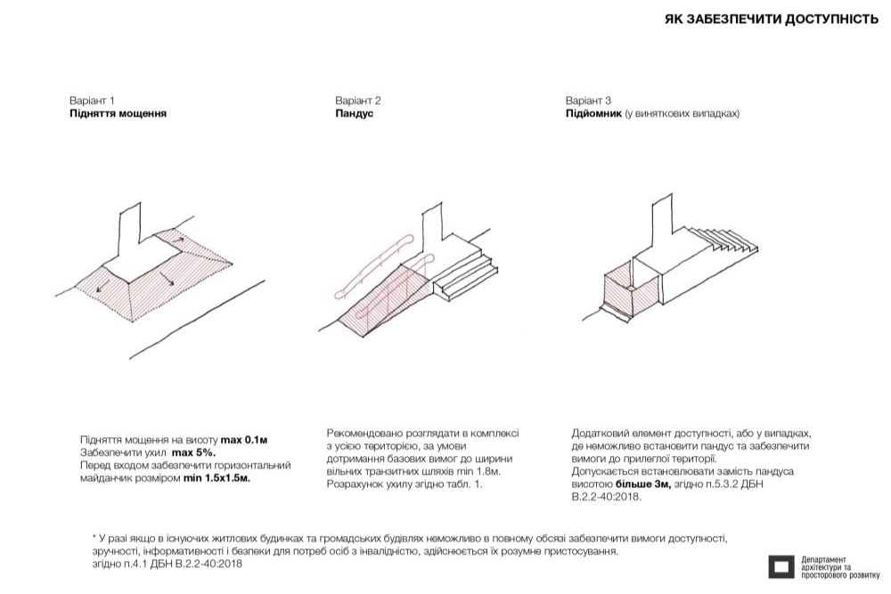 Для доступності будинків на вході пропонують підняття мощення, пониження підлоги й облаштування пандуса чи підйомника.